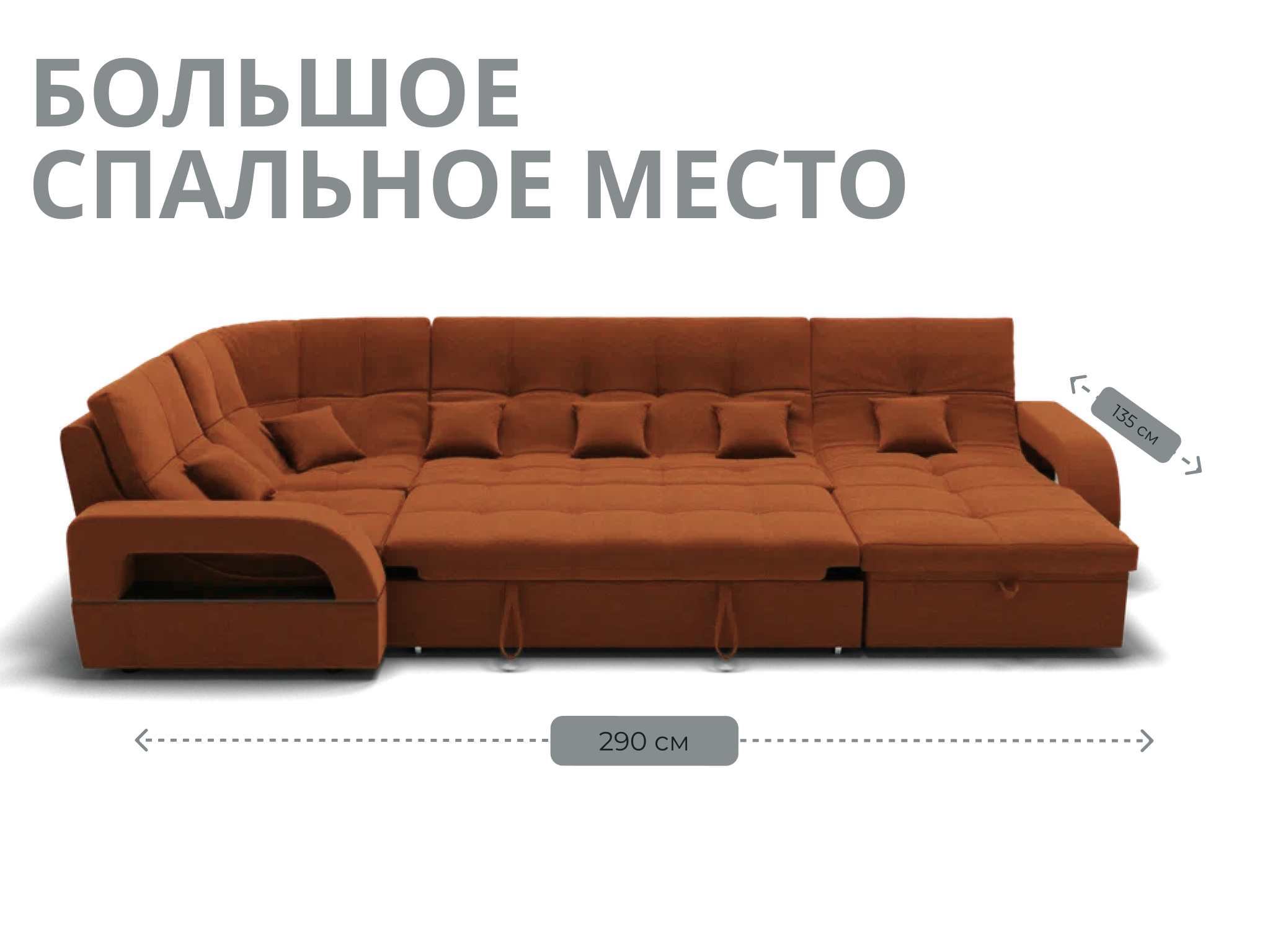Спальное место имеет ширину 135 см и длину 290 см. Он предназначен для двух человек и имеет глубину сиденья 65 см. Максимальная нагрузка на диван составляет 280 кг.