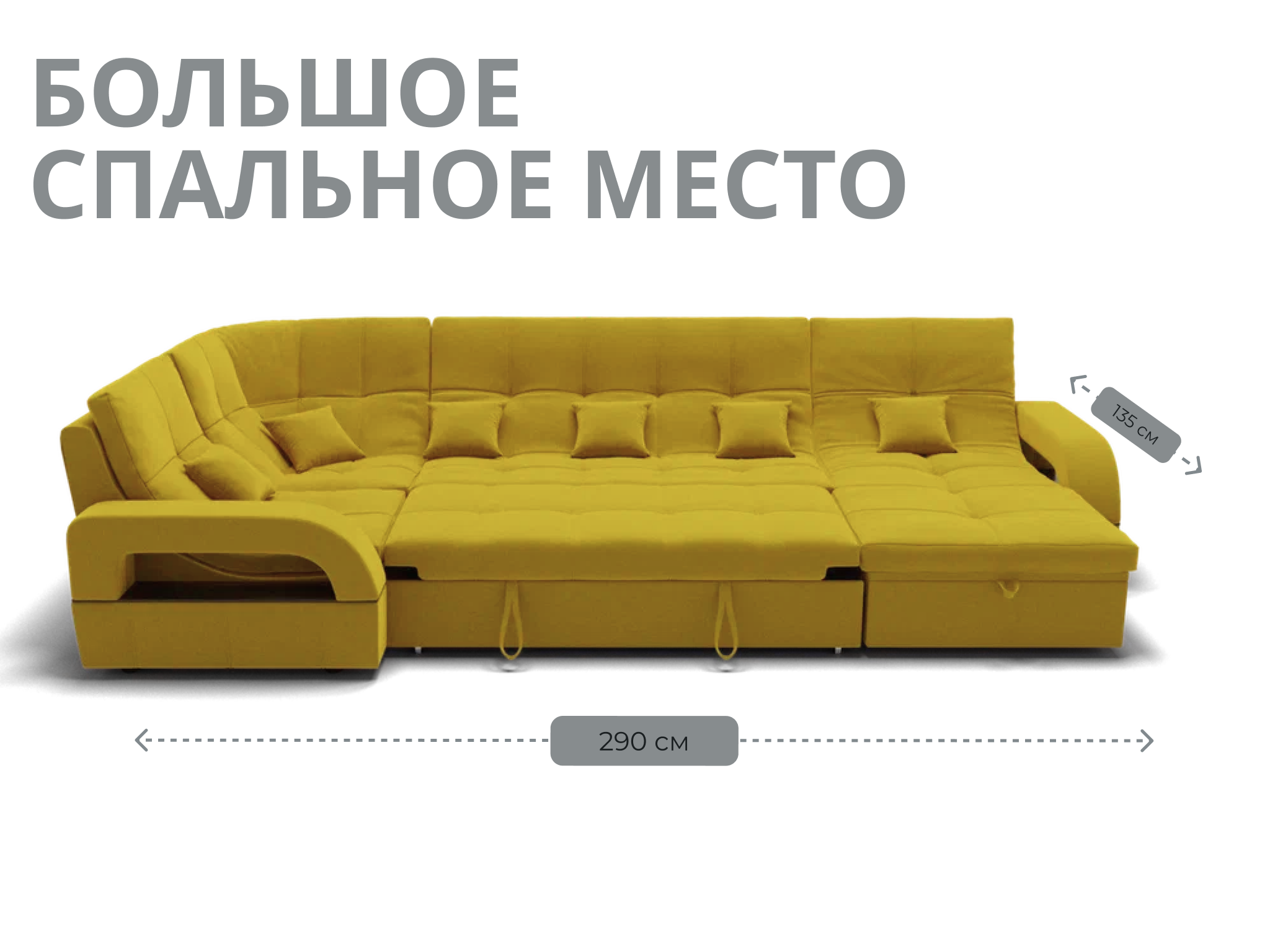 Спальное место имеет ширину 135 см и длину 290 см. Он предназначен для двух человек и имеет глубину сиденья 65 см. Максимальная нагрузка на диван составляет 280 кг.