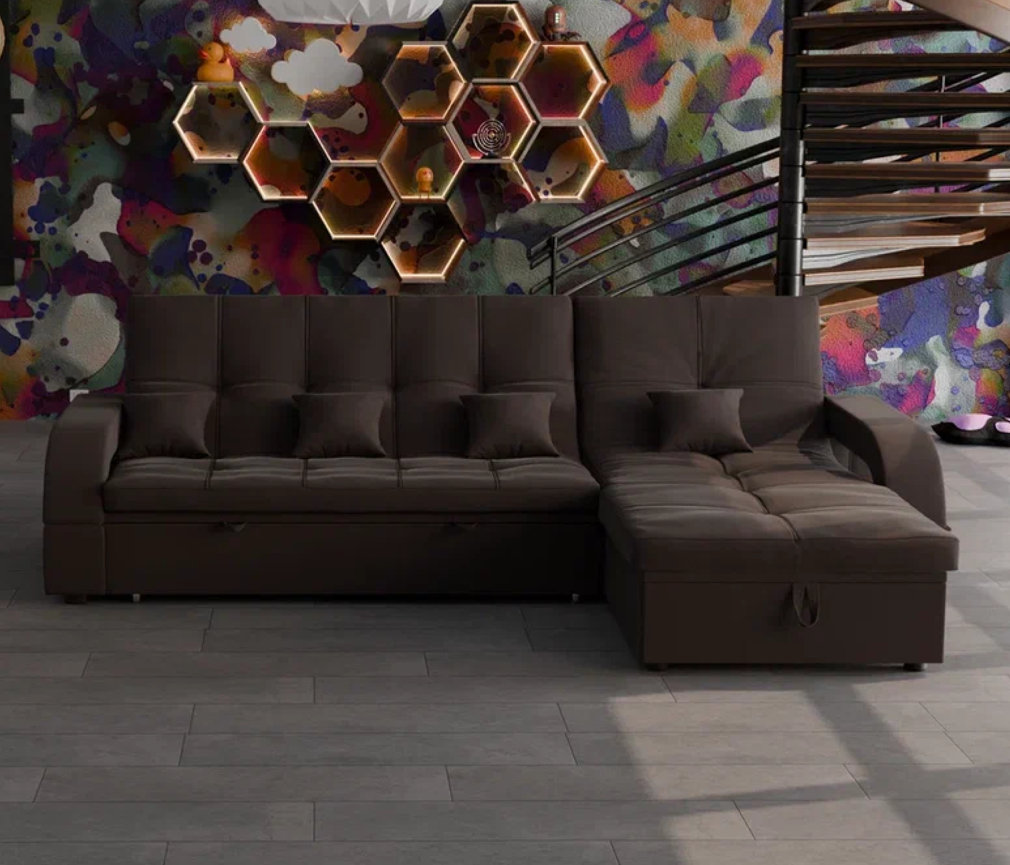 Он имеет высоту 97 см, ширину 268 см и глубину 175 см. Диван обладает универсальным расположением угла, что позволяет его использовать в любом помещении.