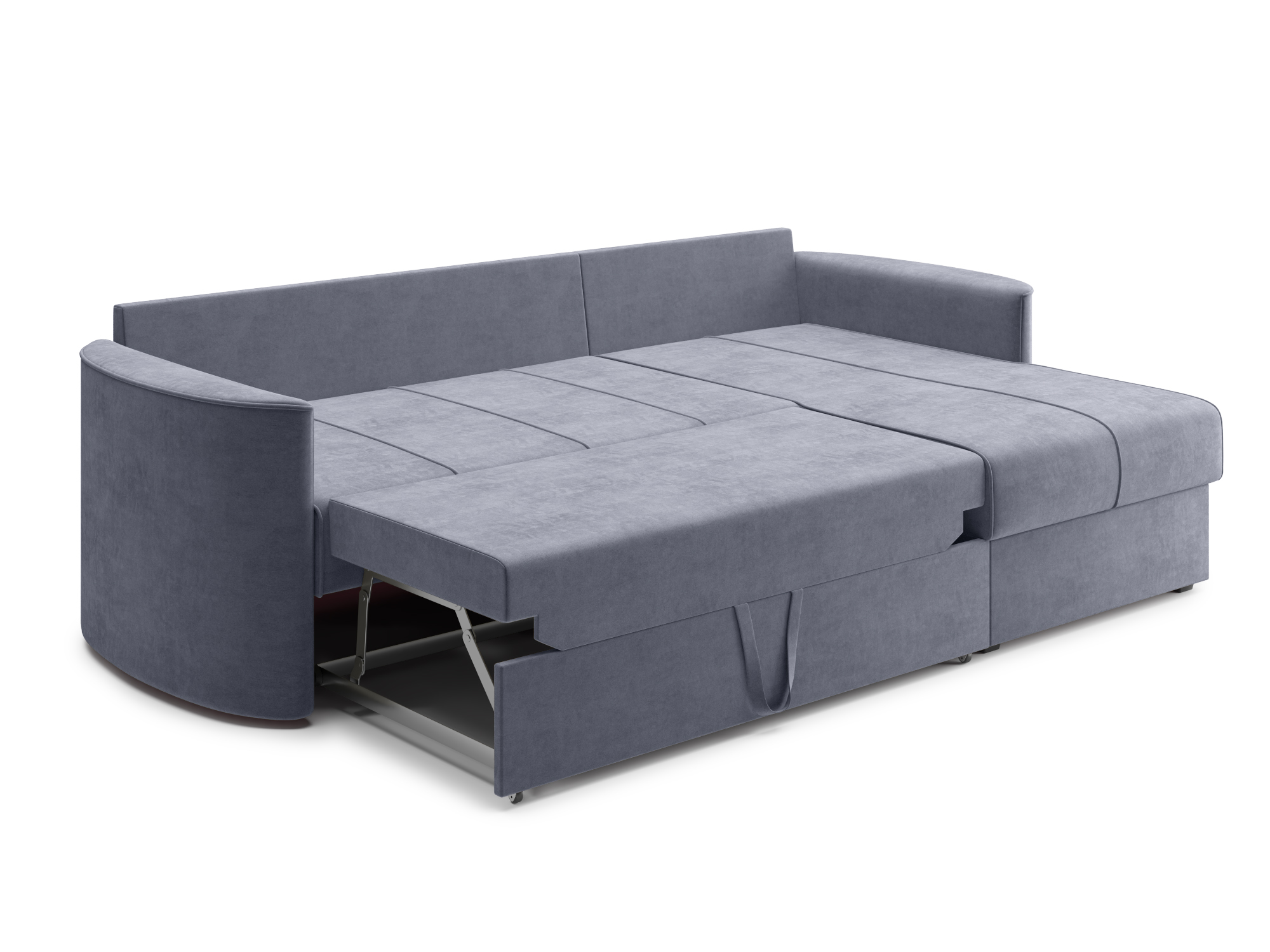 - Механизм раскладки дельфин – основан на выкатывании дополнительной платформы, скрытой под сидением дивана. Чтобы разложить диван, нужно потянуть за специальные ремешки, помогающие перемещать элементы конструкции. В результате этого действия нижняя часть дивана начнёт перемещаться. Делать это нужно до тех пор, пока часть не выдвинется максимально вперед. Затем следует немного приподнять элемент и упереть в противоположную часть, которая осталась неподвижной. Под сиденьем дивана находится короб для хранения вещей и постельных принадлежностей.