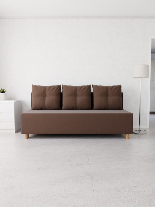 Материал каркаса дивана-кровати изготовлен из ДВП, ЛДСП и массива дерева, что обеспечивает прочность и долговечность. Наполнитель выполнен из пенополиуретана, что делает диван мягким и удобным для сидения.