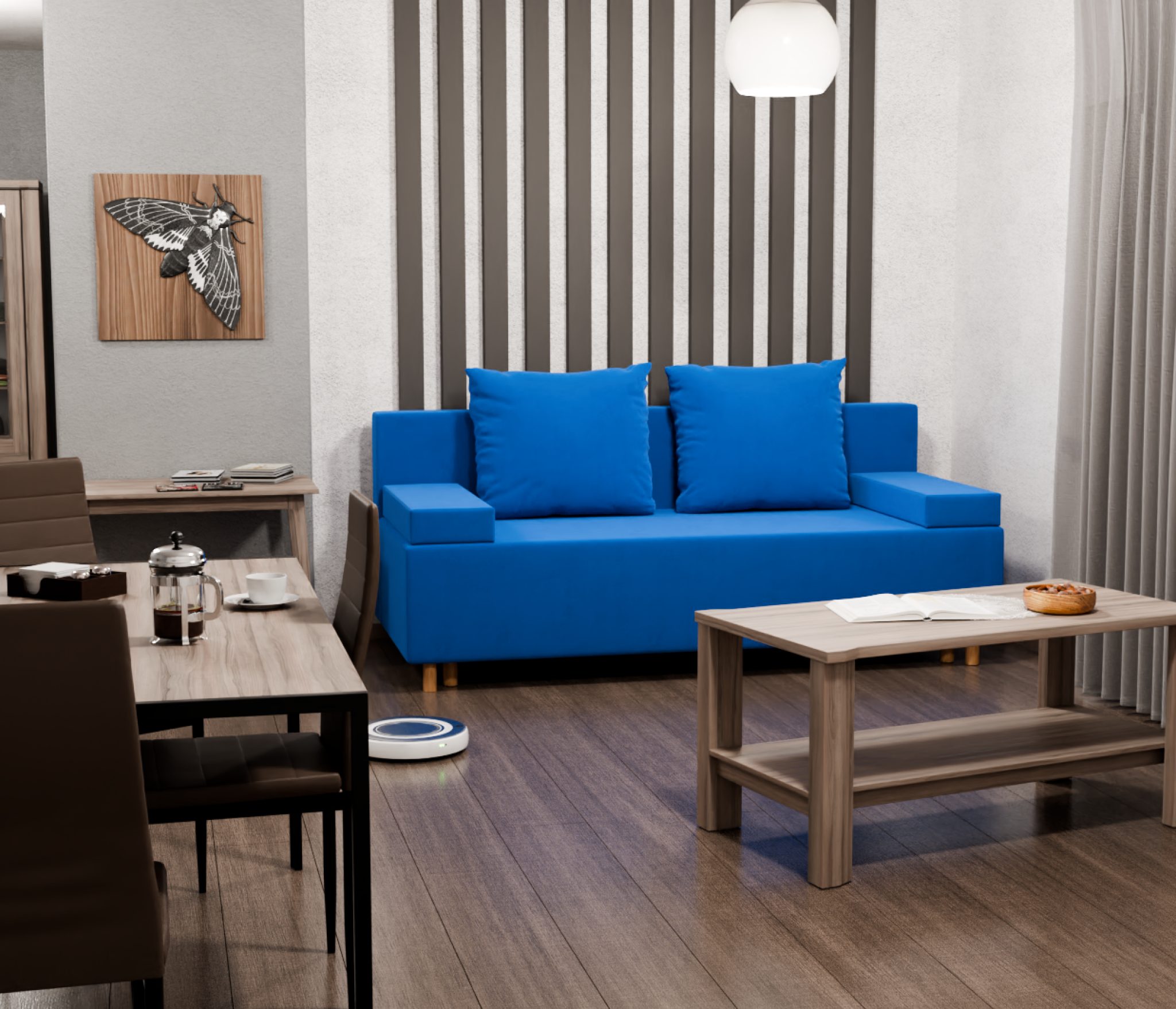 Диван-кровать имеет универсальный угол, что позволяет установить его в любой комнате, даже если она небольшая. Обивка выполнена из высококачественного велюра, который не только выглядит стильно, но и легко чистится.