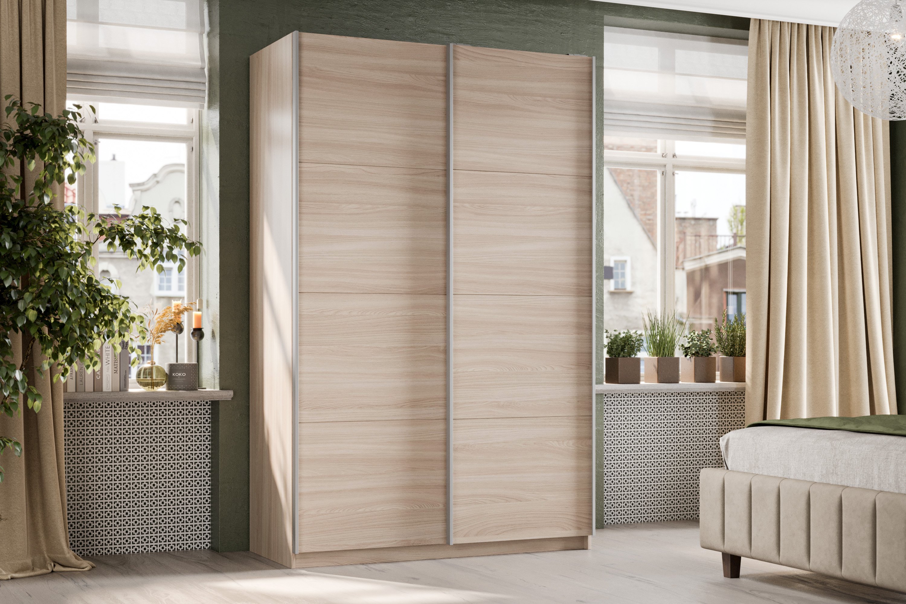 Корпус выполнен из ламинированного ДСП и оснащен качественной верхней подвесной системой-купе со встроенными доводчиками производства фирмы Hettiсh, изготовленной из легкого и прочного алюминия .