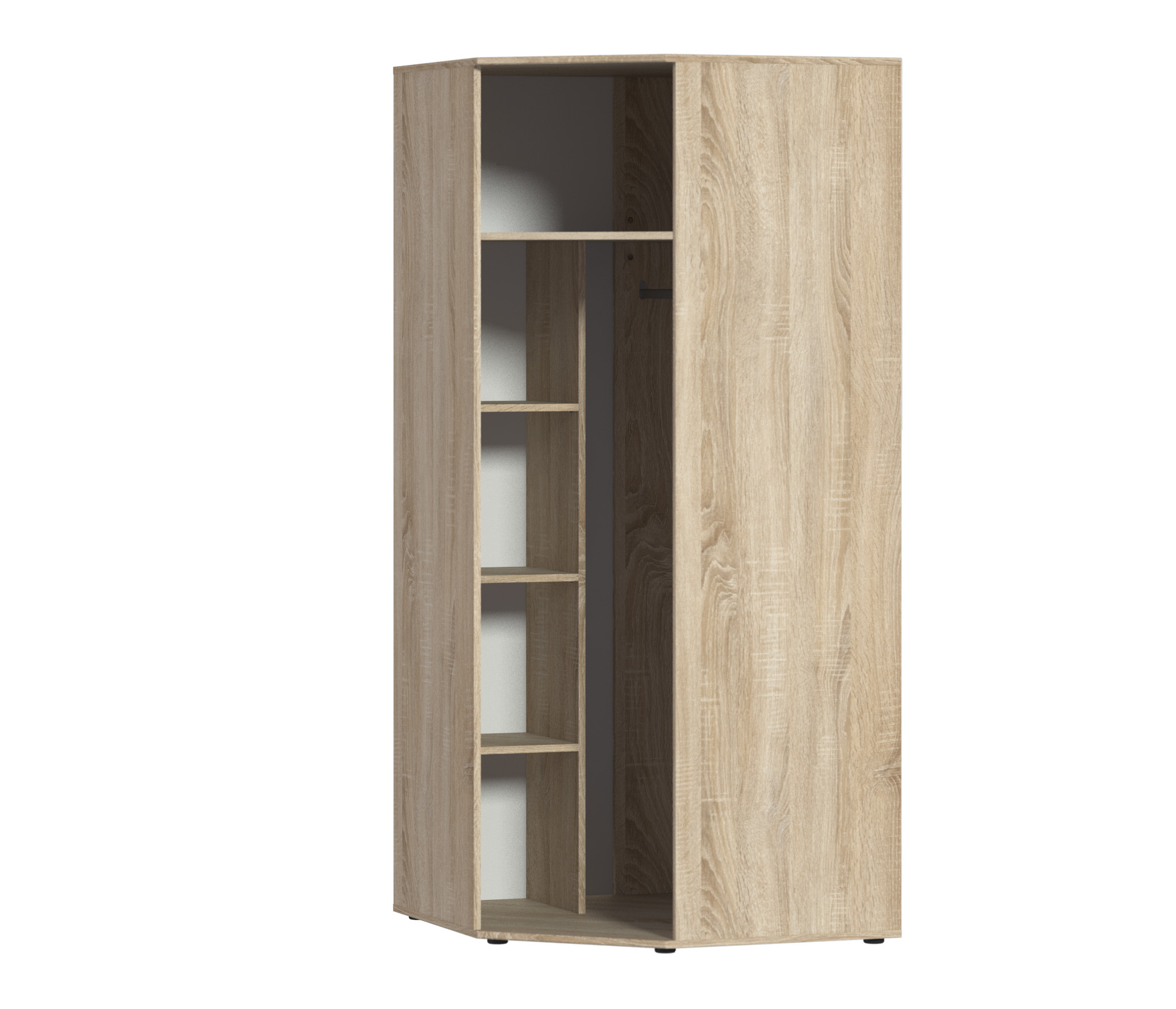 Габариты углового шкафа Мамбо СБ-2678 – ширина 86 см, высота 191 см и глубина 86 см. Это одно вместительное отделение со штангой для верхней одежды с антресолью сверху. Выполнен шкаф из прочного и современного материала КДСП. Цвет отделки корпуса – «Дуб Сонома», а фасадные поверхности белого цвета. Благодаря светлым тонам, шкаф не выглядит громоздким.