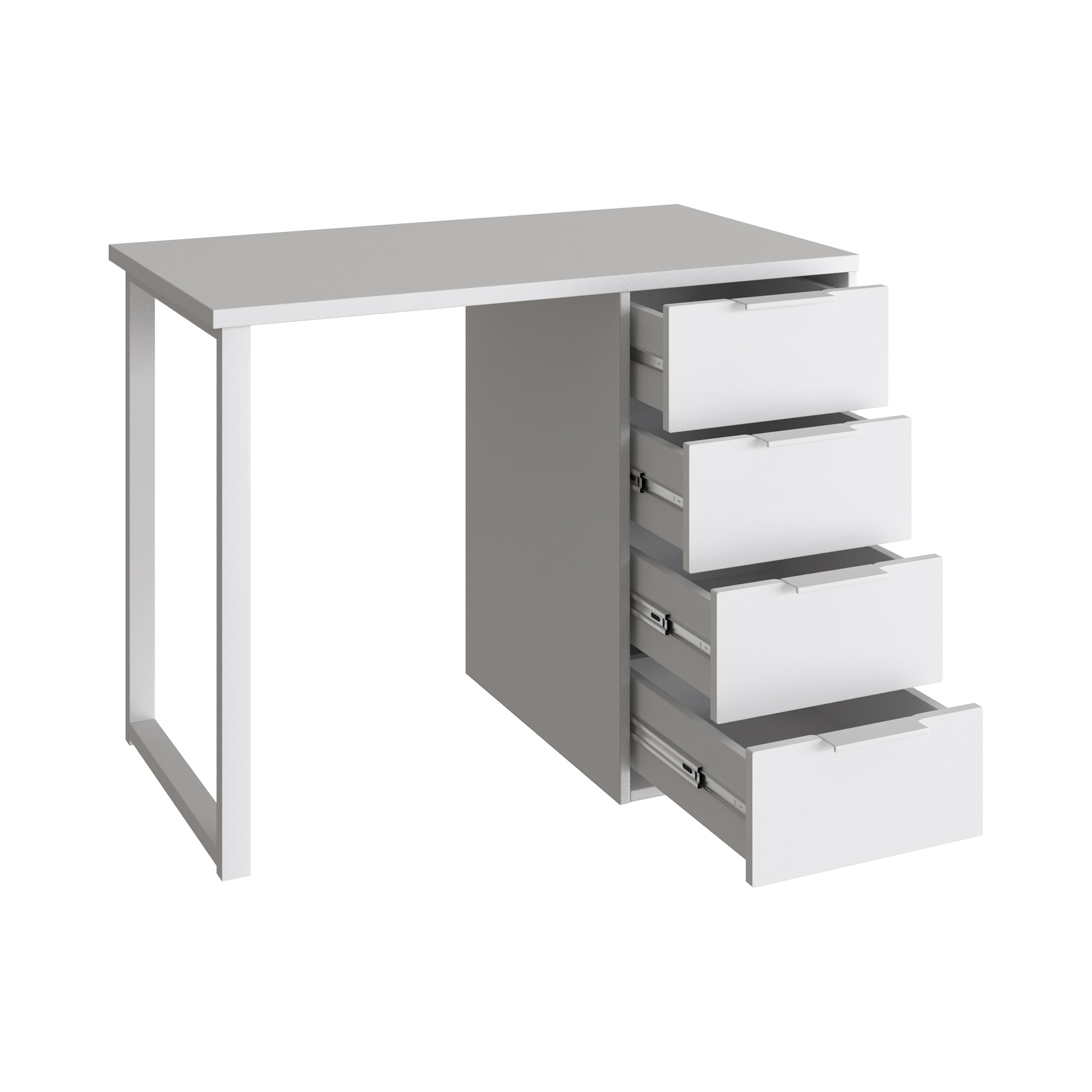 Стол компьютерный, письменный С-414 - это идеальное решение как для большого пространства, так и для небольшой комнаты. Стол прямой обеспечивает максимальную вместительность и удобство использования. Стол оснащен стильной металлической ножкой. Четыре выдвижные ящика - вместительны и комфортны в расположении. Не нужно никуда вставать, за важными документами или вещами, достаточно расположить все рядом с собой! Стол может быть собран в зеркальном варианте «правым» или «левым». Столешница изготовлена из ЛДСП 25 мм, фасады МДФ 16 мм. Дно ящика ДВП 3 мм. Фурнитура: ручки, опора металл, телескопические направляющие полного выдвижения без доводчиков.