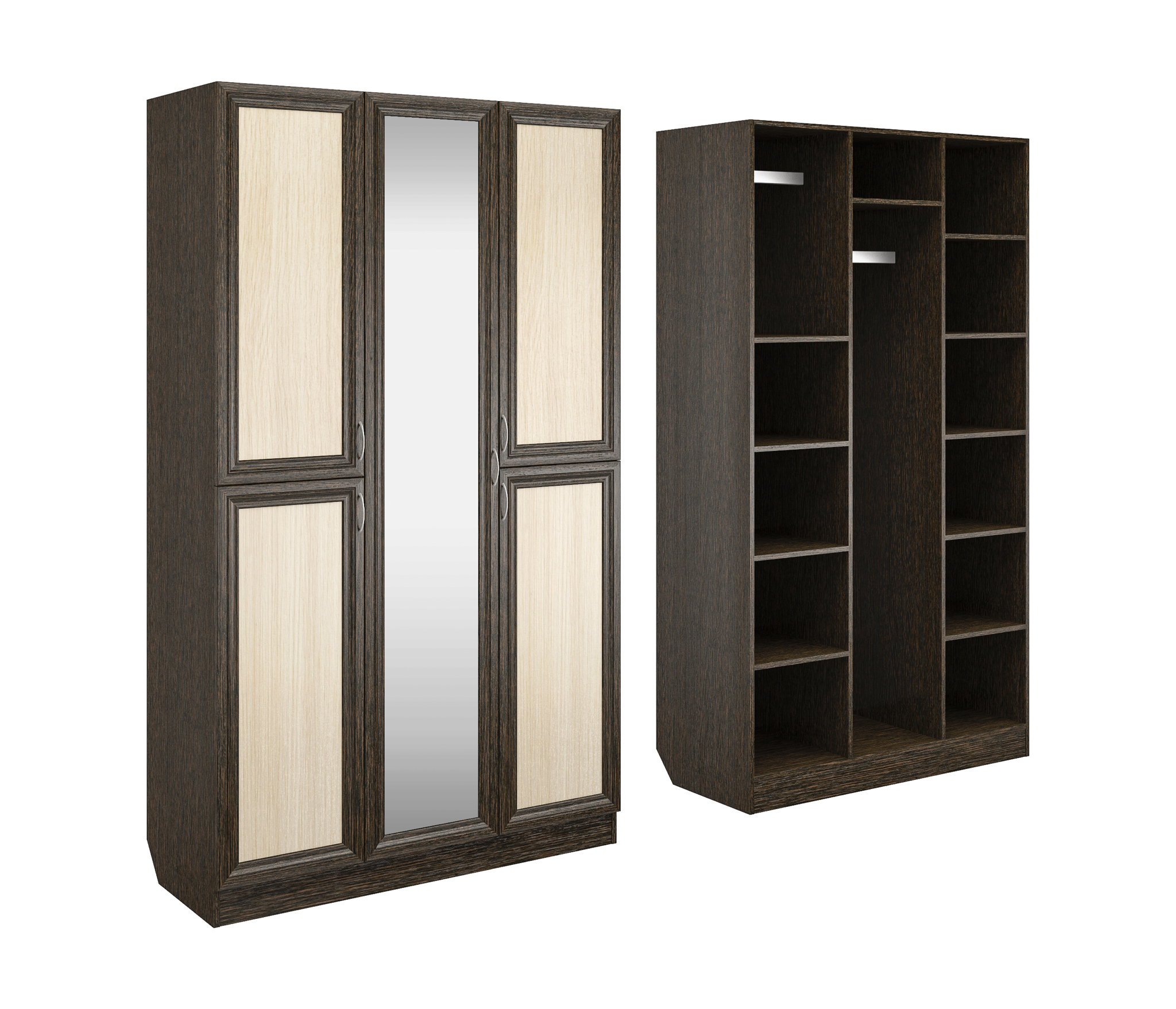 Корпус шкафа выполнен из Ламинированной ДСП высокого качества с насыщенным цветом. Фасады выполнены из материала МДФ.Шириною 120 см., большая и функциональная модель с отделениями закрытыми на пять распашных дверей. Вверху слева небольшое отделение со штангой, внизу слева две полки. Справа за двумя дверьми шесть ниш. За центральной дверцей сверху узкая ниша и отделение со штангой.В данной моделе установлено зеркало, которое вмонтировано на производстве в рамку фасада двери шкафа.