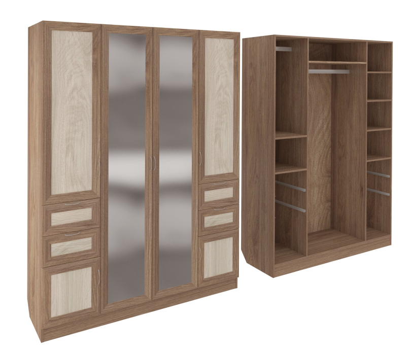 Корпус шкафа выполнен из Ламинированной ДСП высшего качества с насыщенным цветом. Фасады выполнены из материала МДФ.В данной моделе используются зеркала, которые внедрены в рамки фасадов.Шириною 160 см., красивый четырехстворчатый шкаф. В центре 2 большие двери с зеркалами, за ними расположено большое отделение со штангой. Слева Ниша с небольшой штангой и ещё одна маленькая для сложенных вещей. Справа четыре таких же ниши. Внизу симметрично с каждой стороны располагается по два выдвижных ящика и по одному отделению закрытому на небольшую дверцу. Зеркала входят в стоимость шкафа.