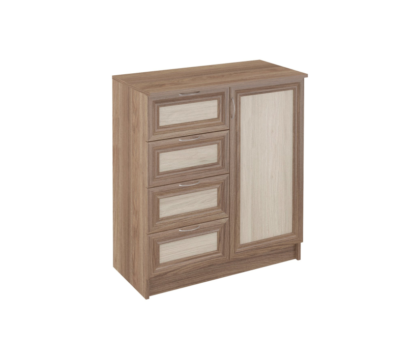 Комод 4 не больших размеров по ширине,состоит из 4-х выдвижных ящиков+дверь,скрывающая полку.Удобен в использовании.Производитель оставляет за собой право менять фурнитуру.