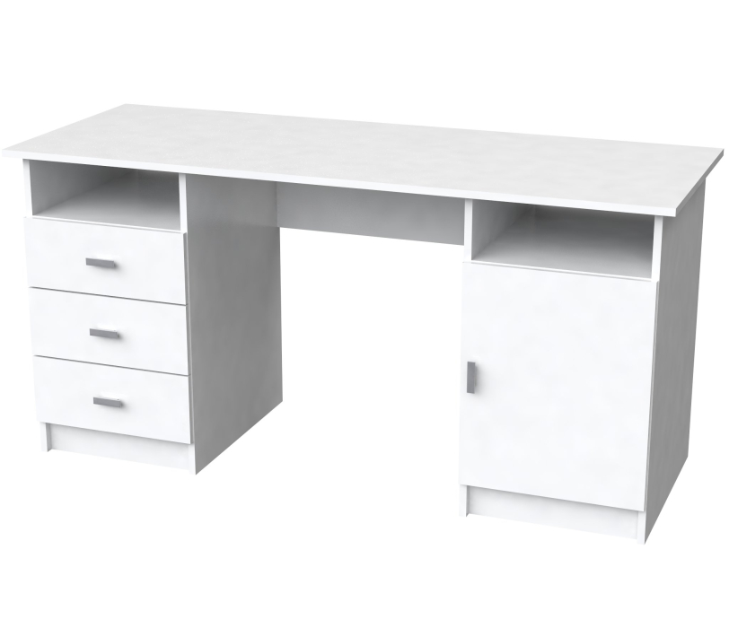 Стол СТ-8 изготовлен из ЛДСП.Оснащён 2-мя тумбами по бокам,одна тумба с дверью,за дверцей полка съёмная),другая оснащена выдвижными ящиками.Ширина 148,4 см,Выс 75 см,глуб 57 см.Удобен в использовании как для кабинета,так и для школьников.