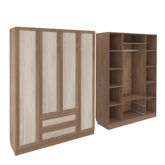 Корпус шкафа выполнен из Ламинированной ДСП высокого качества с насыщенным цветом. Фасады выполнены из материала МДФ.Шириною 160 см., красивый четырехстворчатый шкаф. Слева и справа секции, по четыре полки в каждой.