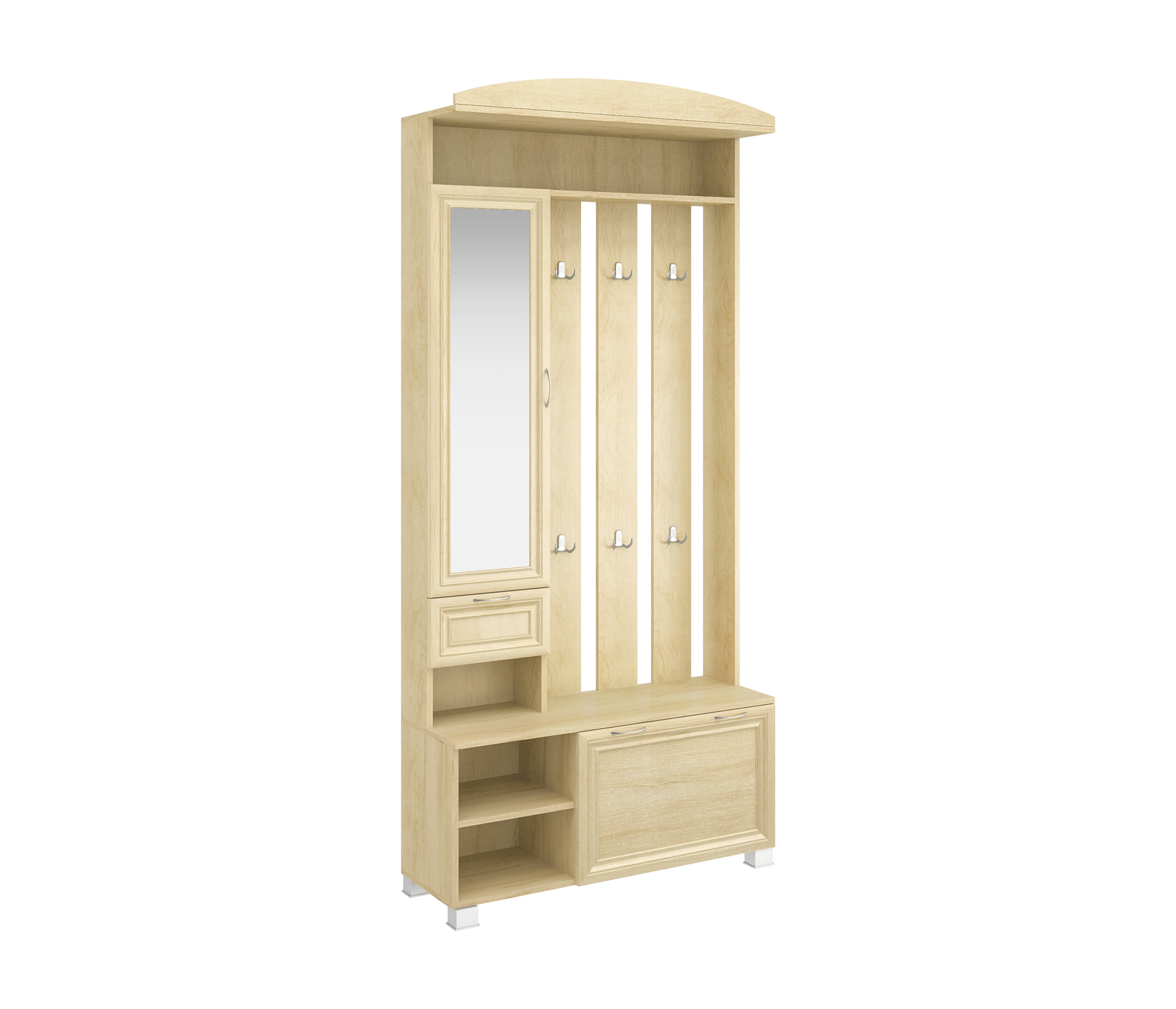 Корпус прихожей выполнен из Ламинированной ДСП высшего качества с насыщенным цветом. Фасады выполнены из материала МДФ и дополнительно укреплены металлическими скобами и силиконом изнутри. Шириною 95 см., данная прихожая похожа на седьмую модель, только без шкафа, разработана специально для тех кому он не нужен. Имеется узкое зеркало над ящиком, а снизу секция за откидной дверцей. Так же есть 5 двойных крючков на вешалке, как и на других моделях. Модель идеально подходит как для не больших помещений.