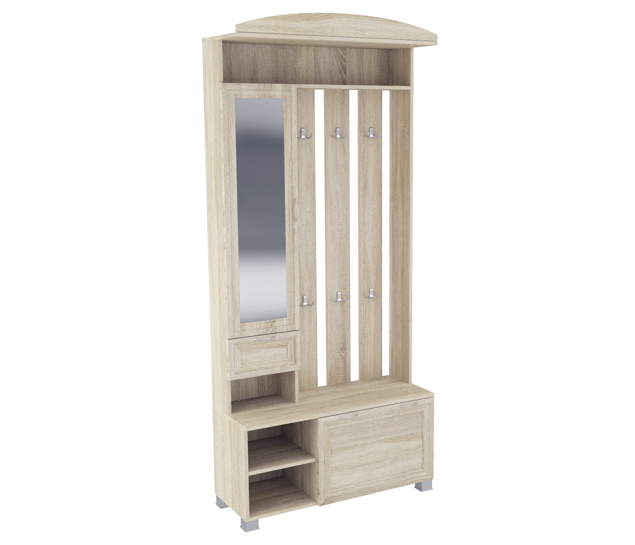 Корпус прихожей выполнен из Ламинированной ДСП высшего качества с насыщенным цветом. Фасады выполнены из материала МДФ и дополнительно укреплены металлическими скобами и силиконом изнутри. Шириною 95 см., данная прихожая похожа на седьмую модель, только без шкафа, разработана специально для тех кому он не нужен. Имеется узкое зеркало над ящиком, а снизу секция за откидной дверцей. Так же есть 5 двойных крючков на вешалке, как и на других моделях. Модель идеально подходит как для не больших помещений.