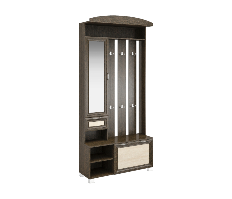 Корпус прихожей выполнен из Ламинированной ДСП высшего качества с насыщенным цветом. Фасады выполнены из материала МДФ и дополнительно укреплены металлическими скобами и силиконом изнутри. Шириною 95 см., данная прихожая похожа на седьмую модель, только без шкафа, разработана специально для тех кому он не нужен. Имеется узкое зеркало над ящиком, а снизу секция за откидной дверцей. Так же есть 5 двойных крючков на вешалке, как и на других моделях. Модель идеально подходит как для не больших помещений.