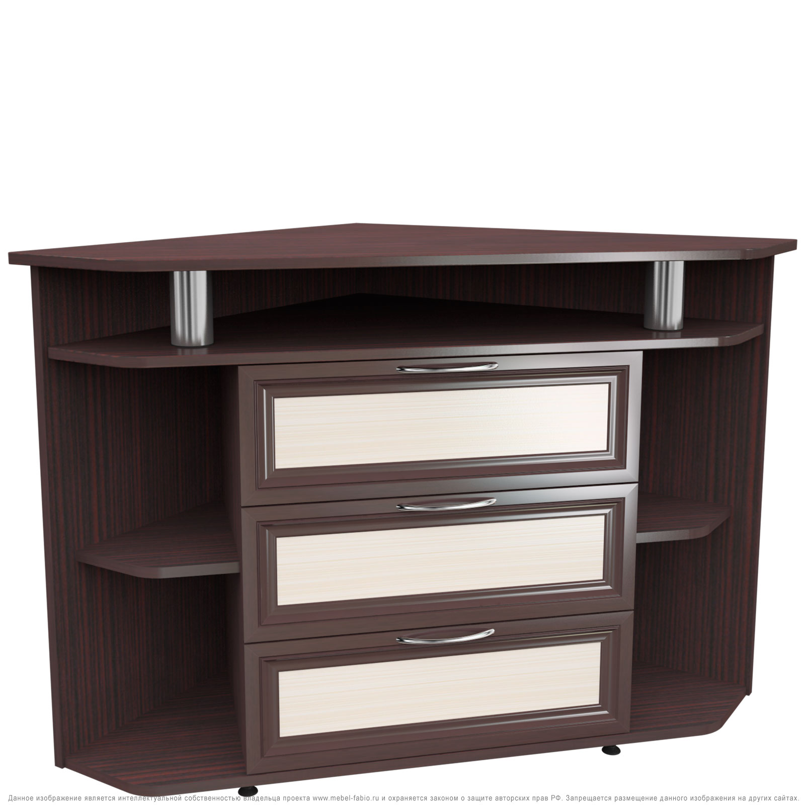 Комод 20 имеет 3 выдвижных ящика в центре, по бокам четыре угловые ниши, вверху полка. Верхняя платформа идеально рассчитана для установки телевизора, с возможностью установки дополнительной аппаратуры в нише под верхней платформой.Корпус комода выполнен из Ламинированной ДСП высокого качества с насыщенным цветом. Фасады выполнены из материала МДФ.Производитель оставляет за собой право менять фурнитуру.