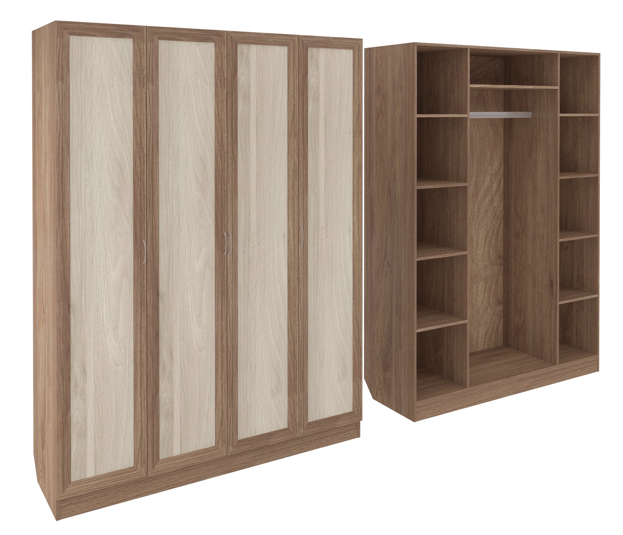 Корпус шкафа выполнен из Ламинированной ДСП высшего качества с насыщенным цветом. Фасады выполнены из материала МДФ.Ширина шкафа 160 см., большая и функциональная четырёхстворчатая модель. В левой и правой секциях ниши для сложенных вещей. Посередине штанга для одежды и полка над штангой.