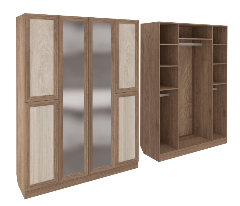 Корпус шкафа выполнен из Ламинированной ДСП высокого качества с насыщенным цветом. Фасады выполнены из материала МДФ.В данной моделе используются зеркала, которые внедрены в рамки фасадов.Шириною 160 см., красивый и большой четырехстворчатый шкаф. В центре 2 большие створки с зеркалами, за ними расположено большое отделение со штангой. Симметрично расположенные крайние отделения закрываются на верхние и нижние распашные двери. Вверху у каждого по три ниши, внизу по штанге. Два зеркала в данной моделе уже включены в стоимость.