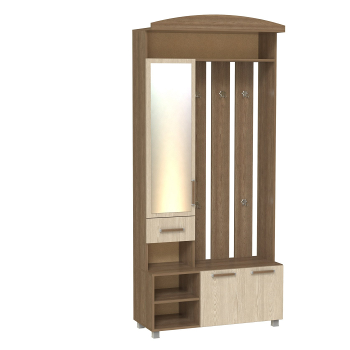 Корпус и фасады прихожей выполнен из Ламинированной ДСП высшего качества с насыщенным цветом. Шириною 95 см., данная прихожая похожа на седьмую модель, только без шкафа, разработана специально для тех кому он не нужен. Имеется узкое зеркало над ящиком, а снизу секция за откидной дверцей. Так же есть 5 двойных крючков на вешалке, как и на других моделях. Модель идеально подходит как для не больших помещений.