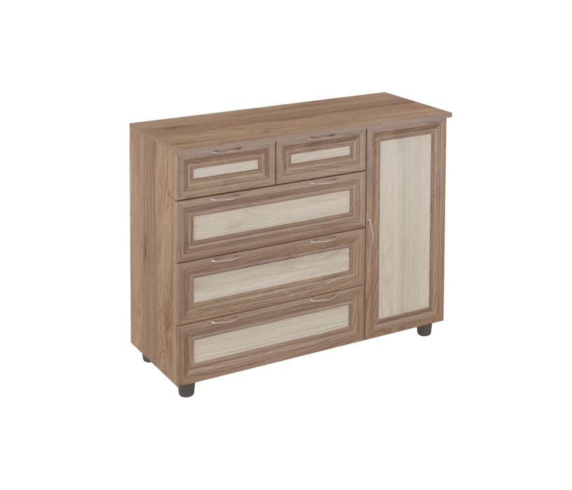 Комод 7 отличается большими размерами и многофункциональностью.3 больших+2 маленьких выдвижных ящика,позволят разместить множество вещей.Дверь,скрывающая полку,позволяет разместить более крупные вещи.Корпус из высококачественного ЛДСП,фасады рамочные МДФ.Производитель сохраняет за собой право менять фурнитуру.