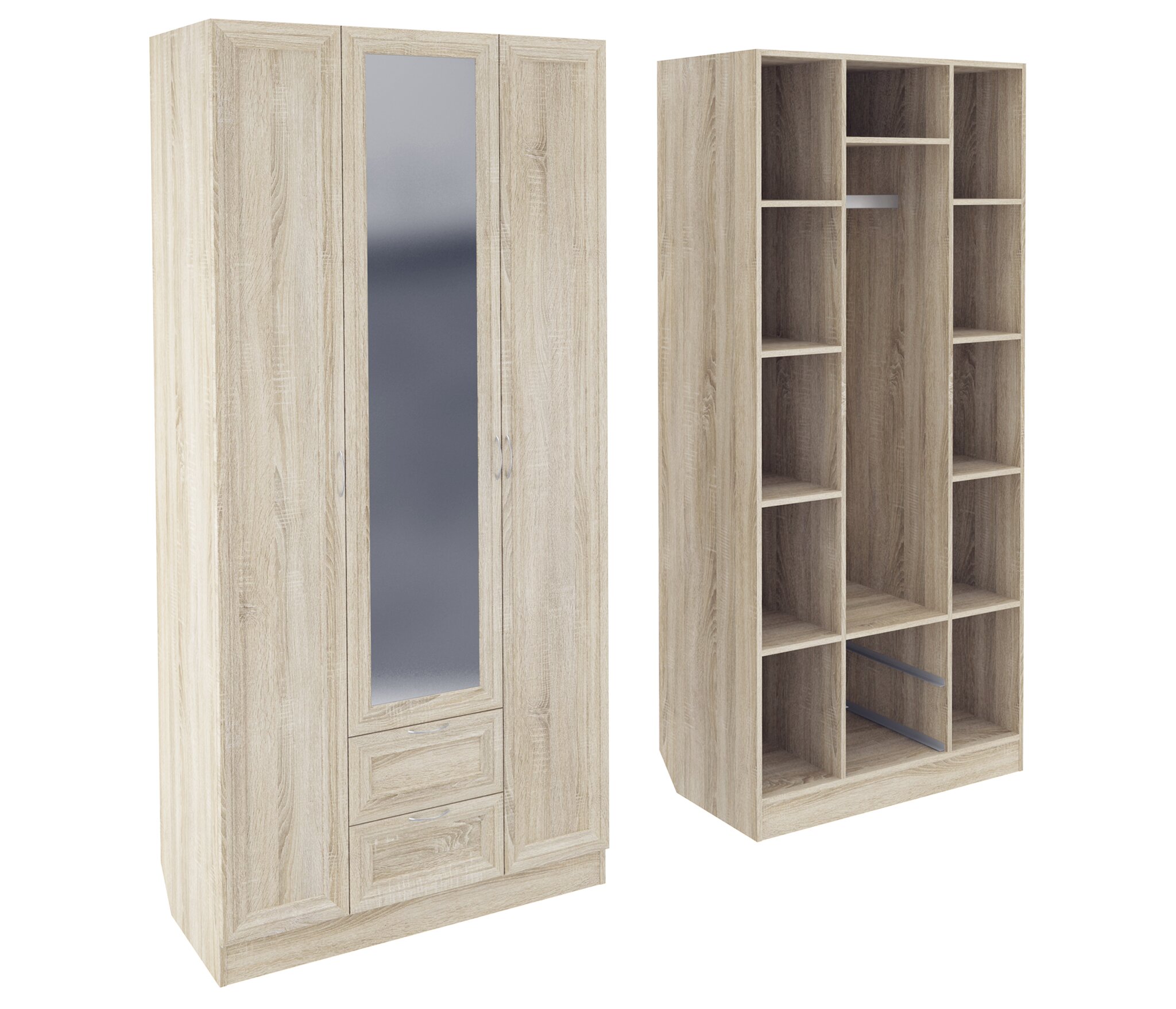 Корпус шкафа выполнен из Ламинированной ДСП высокого качества с насыщенным цветом. Фасады выполнены из материала МДФ.В данной моделе установлено зеркало, которое монтируется прямо в рамку фасада двери шкафа непосредственно на производстве.Шириною 100 см., большая и функциональная модель с отделениями закрытыми на три распашные двери. С права и слева симметрично друг другу, за дверками, располагаются отделения по пять полок в каждом. В центре за дверкой вверху небольшое отделение, сразу под ним отделение со штангой, внизу располагаются два выдвижных ящика. В данной моделе встроено одно зеркало в дверку и оно уже включено в стоимость шкафа.