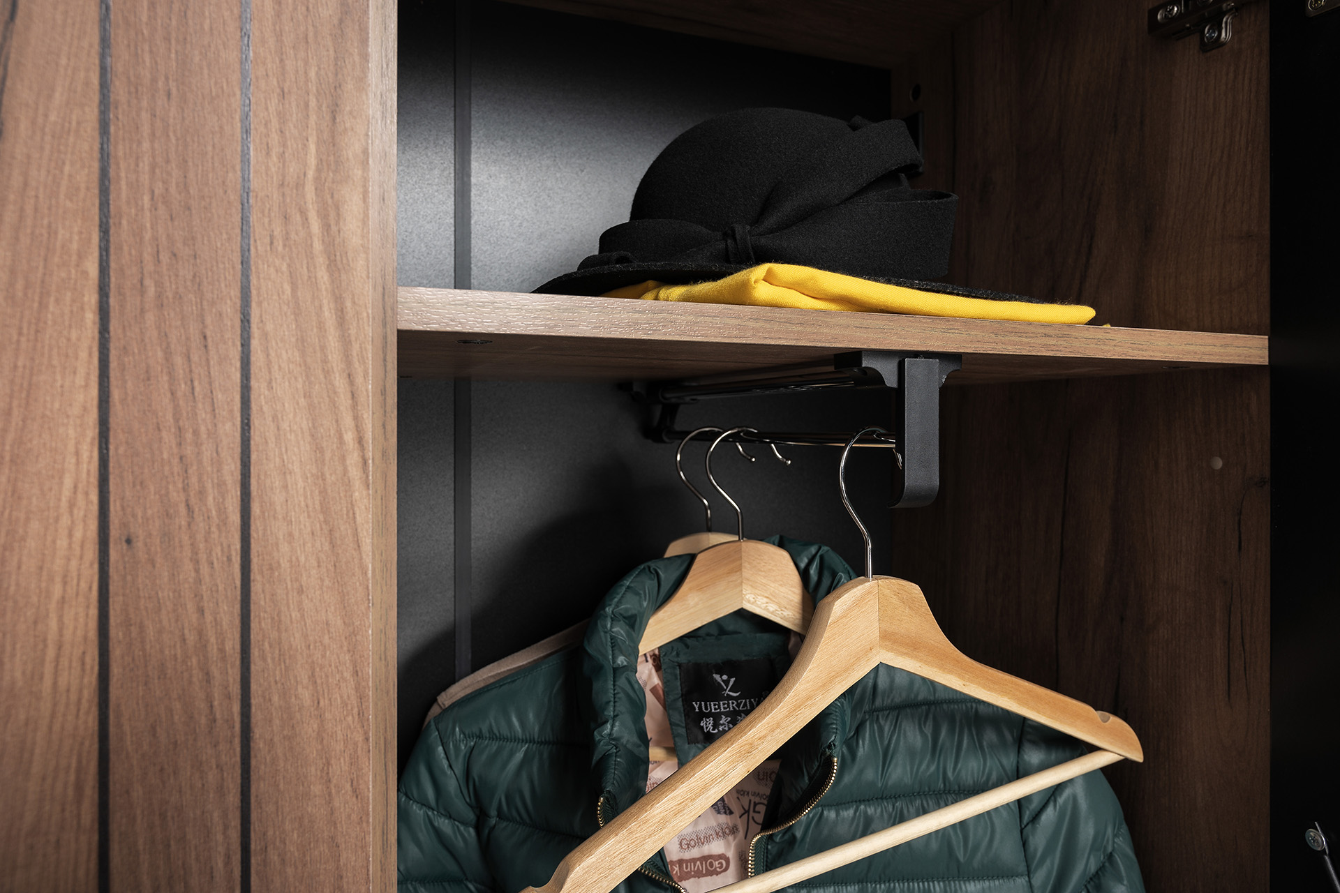 Выдвижная усиленная штанга в шкафу обеспечивает компактное хранение верхней одежды. Направляющие и петли оснащены доводчиками.