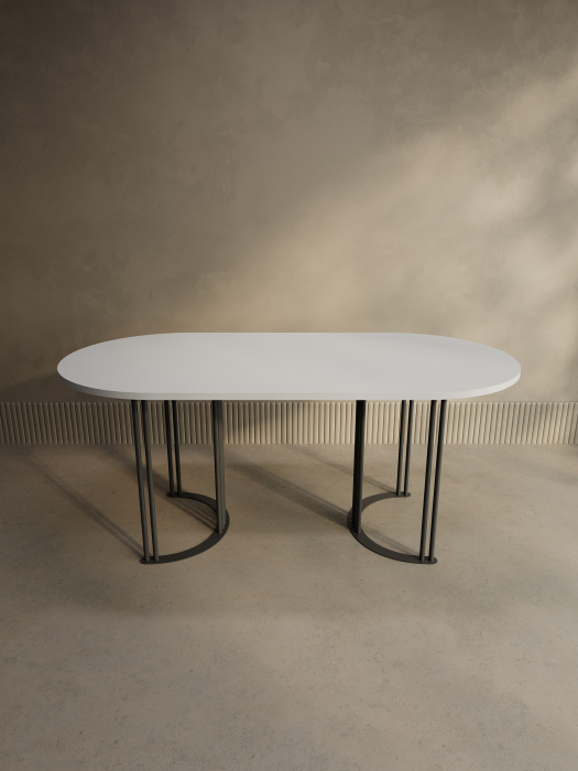 Дизайнерский обеденный стол серия VIOLUR. Обеденный стол - неотъемлемая деталь кухонного интерьера, центр внимания и залог комфортной трапезы. Дизайнерский стол в минималистичном стиле станет гармоничным дополнением кухонного или офисного пространства.Овальный кухонный стол, состоящий из столешницы белого цвета и черного металлического подстолья, не только прекрасно впишется в интерьер вашего дома, но и станет незаменимым элементом вашего обеденного пространства. Он прекрасно сочетается со стилем LOFT и однозначно будет притягивать взгляды окружающих. Обеденный овальный стол придаёт кухне стильный и современный вид. Создает гармоничное пространство, располагая к уютным беседам и веселым застольям. Кухонный стол — это не просто предмет мебели, а место для теплых воспоминаний и общения с близкими.Кроме того, этот стол также может быть использован как письменный стол, или как рабочий стол, его эргономичный дизайн обеспечит комфорт и удобство. Стол VIOLUR идеально подойдет для офиса или переговорной комнаты. За ним можно провести продуктивные рабочие встречи, обсудить важные вопросы с партнерами или просто насладиться плодотворной работой.