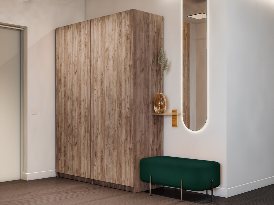 Шкаф оснащен долговечной, ударостойкой кромкой ПВХ, которая защищает торцы от сколов и повреждений, что обеспечит вам комфортное и долгое использование гардероба. Складная система дверей WingLine L с механизмом Push to Move позволяет открыть шкаф всего одним нажатием на фасад. Плавный и тихий ход, надежность в эксплуатации и максимальное складывание дверей — это инновационный подход к организации порядка. Данная система обеспечивает панорамный эффект и свободу в дизайне.