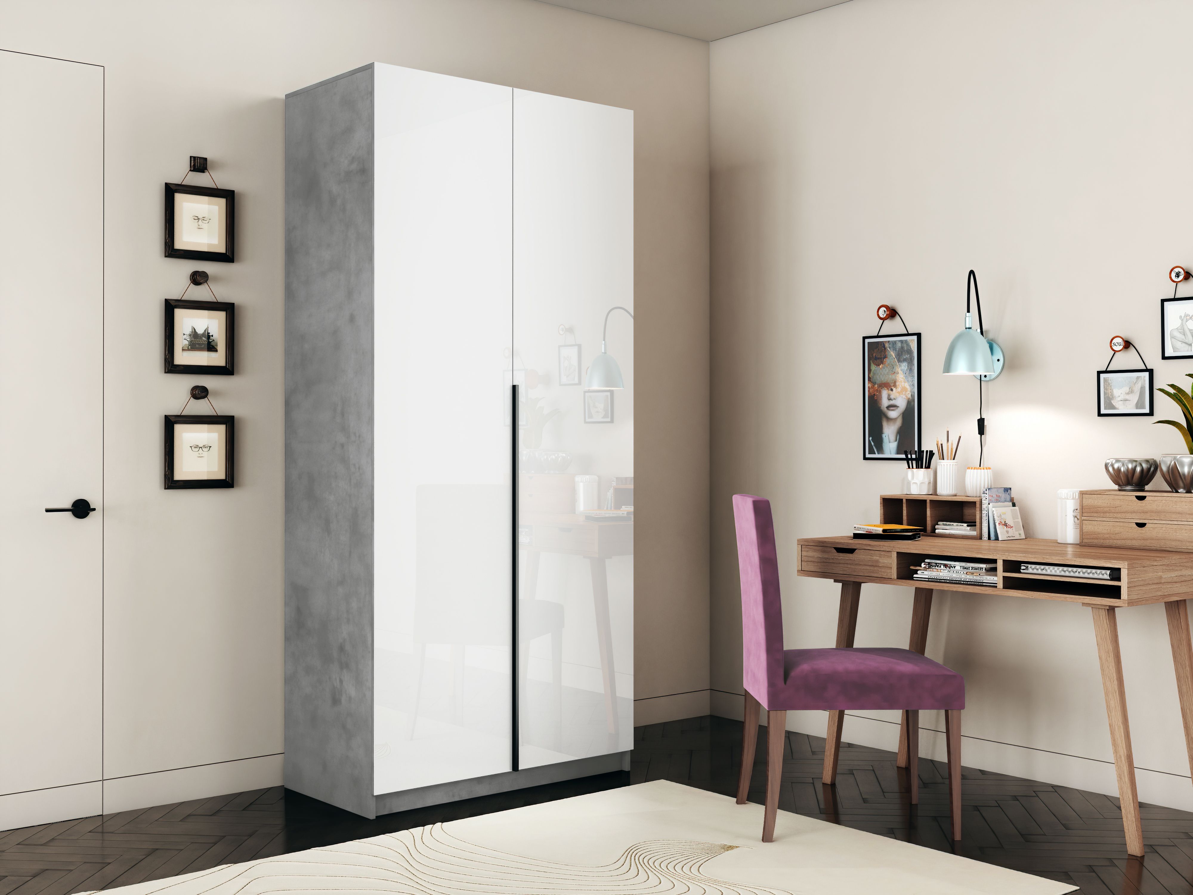 Шкаф распашной Е1 Локер 101x52.5x220 см, с белым стеклом и модулем (бетон) Код I0000426796