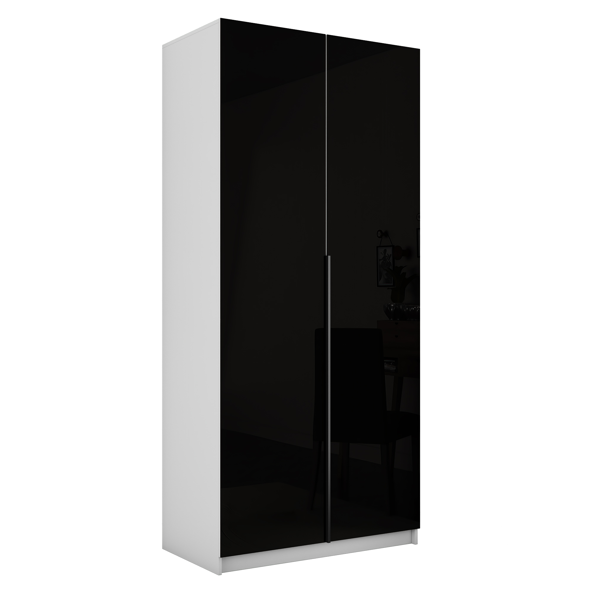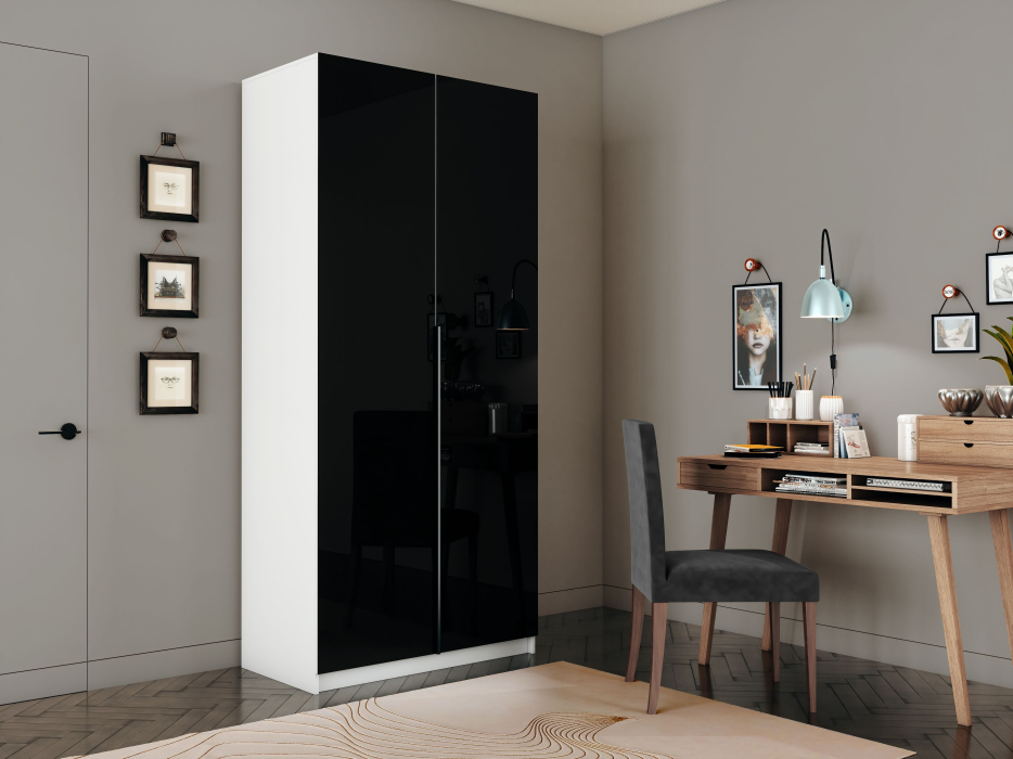 Шкаф распашной Е1 Локер 101x52.5x220 см, с черным стеклом и полками (Белый снег)