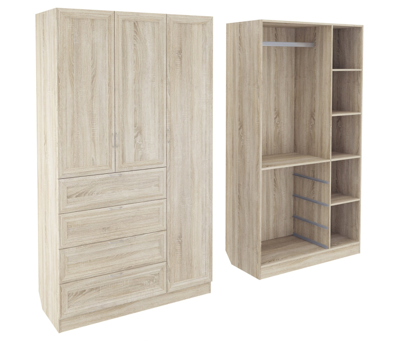 Корпус шкафа выполнен из Ламинированной ДСП высокого качества с насыщенным цветом. Фасады выполнены из материала МДФ.Ширина шкафа 120 см., большая и функциональная модель. Справа за длинной дверцей пять кубических ниш. Слева сверху вниз, узкая ниша, секция со штангой для одежды и четыре достаточно вместительных выдвижных ящика.