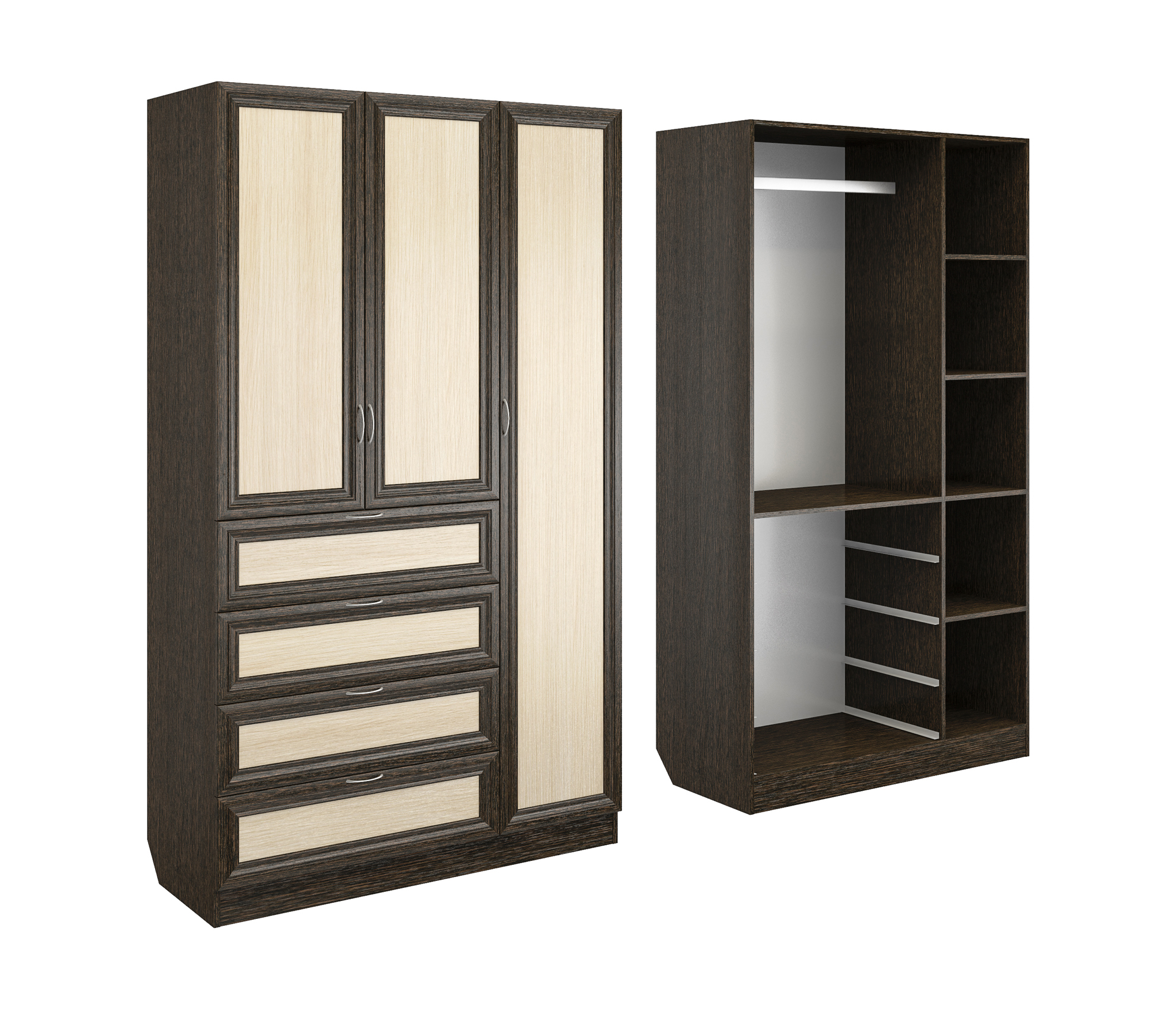 Корпус шкафа выполнен из Ламинированной ДСП высокого качества с насыщенным цветом. Фасады выполнены из материала МДФ.Ширина шкафа 120 см., большая и функциональная модель. Справа за длинной дверцей пять кубических ниш. Слева сверху вниз, узкая ниша, секция со штангой для одежды и четыре достаточно вместительных выдвижных ящика.