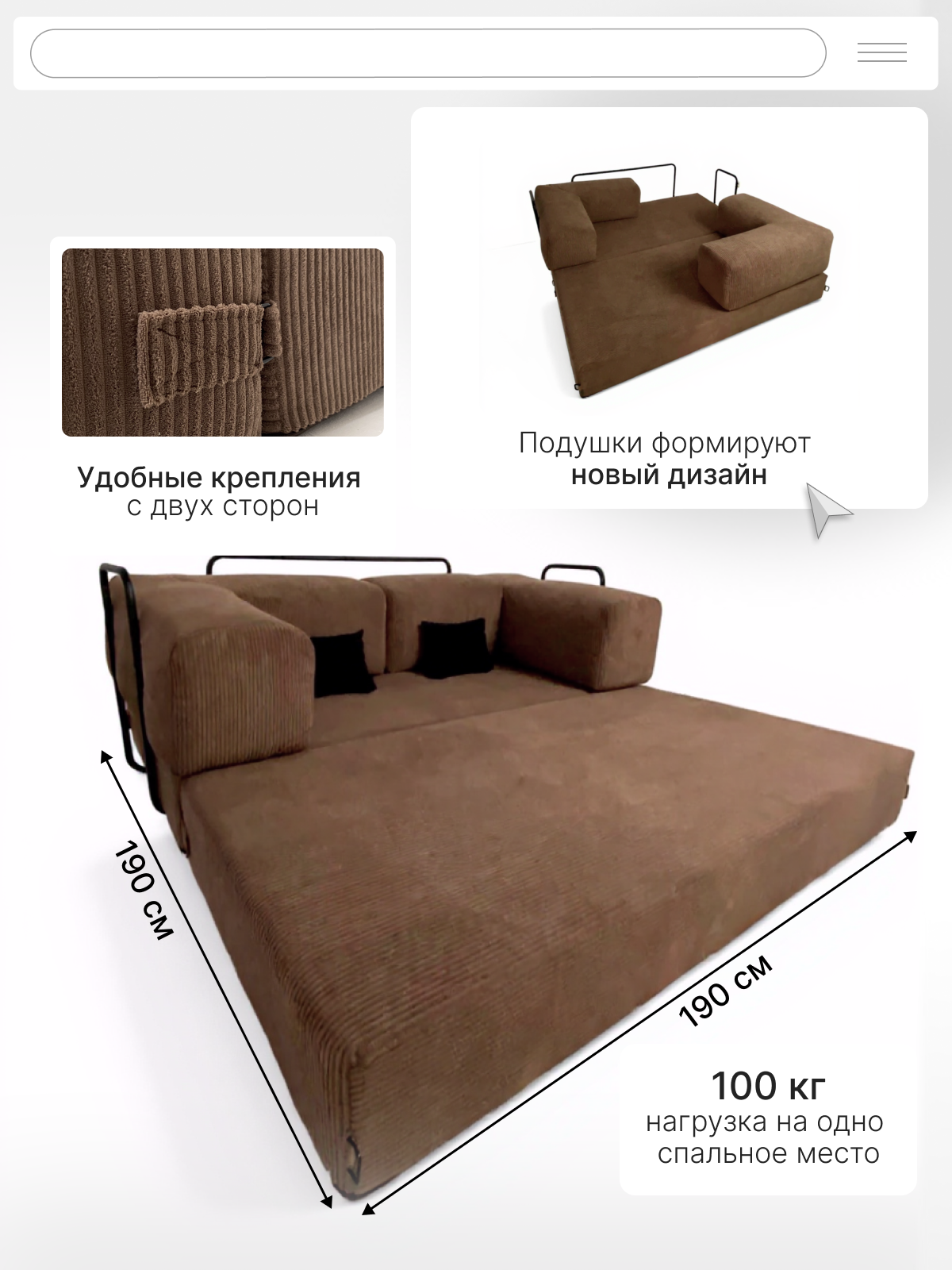 «Клауд» — это большой диван трансформер для каждого. Он станет идеальным двухспальным диваном со спинкой для молодежи, надежным семейным центром для взрослых и безопасной игровой зоной для детей. Представьте его на вашей даче, где он подарит комфортный отдых после насыщенного дня, или на утепленном балконе, превращенном в личный оазис для чтения и релаксации.