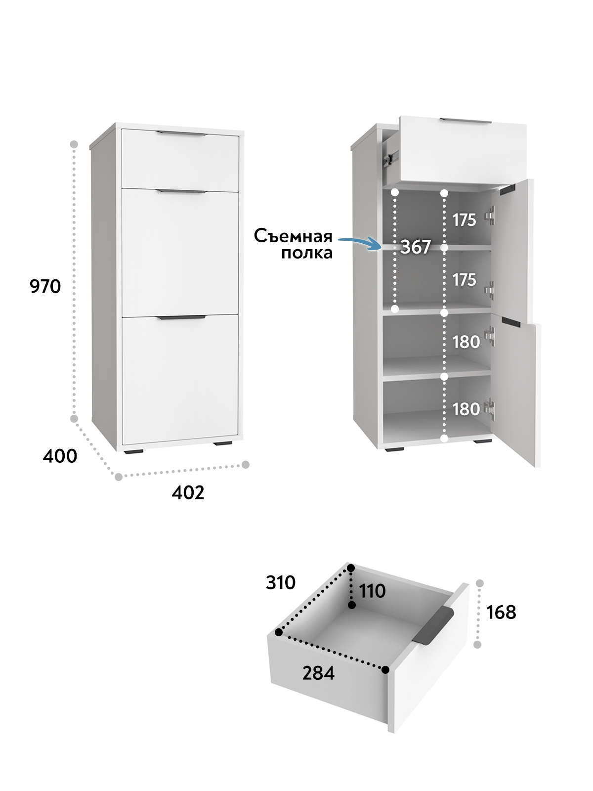 Тумба для обуви Оптима ОП-08 — это идеальный выбор для обустройства прихожей или гардеробной. Ее компактные размеры и продуманная конструкция помогут организовать пространство и сохранить порядок. Основные характеристики: Размеры: 402х970х400 мм (ширина/высота/глубина). Цвета: белый структурный/графит — сочетание современного дизайна и практичности. Материалы: корпус из ЛДСП 16 мм, фасады из МДФ 16 мм. Преимущества тумбы Оптима ОП-08: Функциональность: полки за распашными дверьми и выдвижной ящик для мелочей. Удобство использования: свес крышки на 25 мм обеспечивает прилегание к стене с любым плинтусом. Качественная фурнитура: металлические ручки, петли с доводчиками, телескопические направляющие полного выдвижения без доводчиков, регулируемые опоры высотой 20мм. Доставка и сборка: мебель поставляется в разобранном виде, в надежной упаковке, с подробной инструкцией по сборке. Сборка осуществляется самостоятельно или с привлечением специалистов. Рекомендуется монтаж к стене для дополнительной устойчивости.