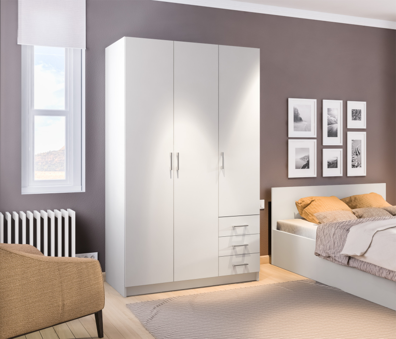 Габаритные размеры шкафа Терра: ширина 120 см, высота 200 см и глубина 57 см. Он может быть отдельным предметом мебели, а также частью гарнитура. Шкаф имеет вместительное плательное отделение со штангой, над которым расположена антресоль и отделение с полками и тремя выдвижными ящиками, где можно хранить мелкие аксессуары. Выполнен шкаф из прочного и качественного ЛДСП. Цвет Белый.