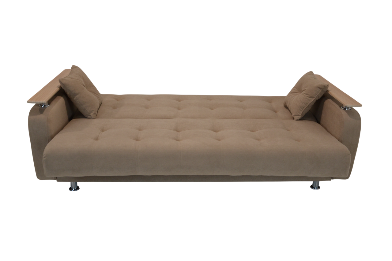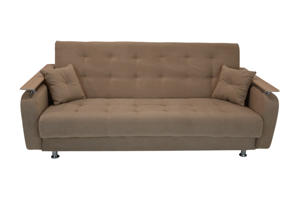 Габариты: 2100*900*1100; Спальное место: 1850*1200. Материалы: пиломатериал хвойных пород, фанера, ДВП, ДСП. Ткань велюр. Синтепон, войлок, пружинный блок. Ящик для белья. На подлокотниках декоративные элементы из МДФ.