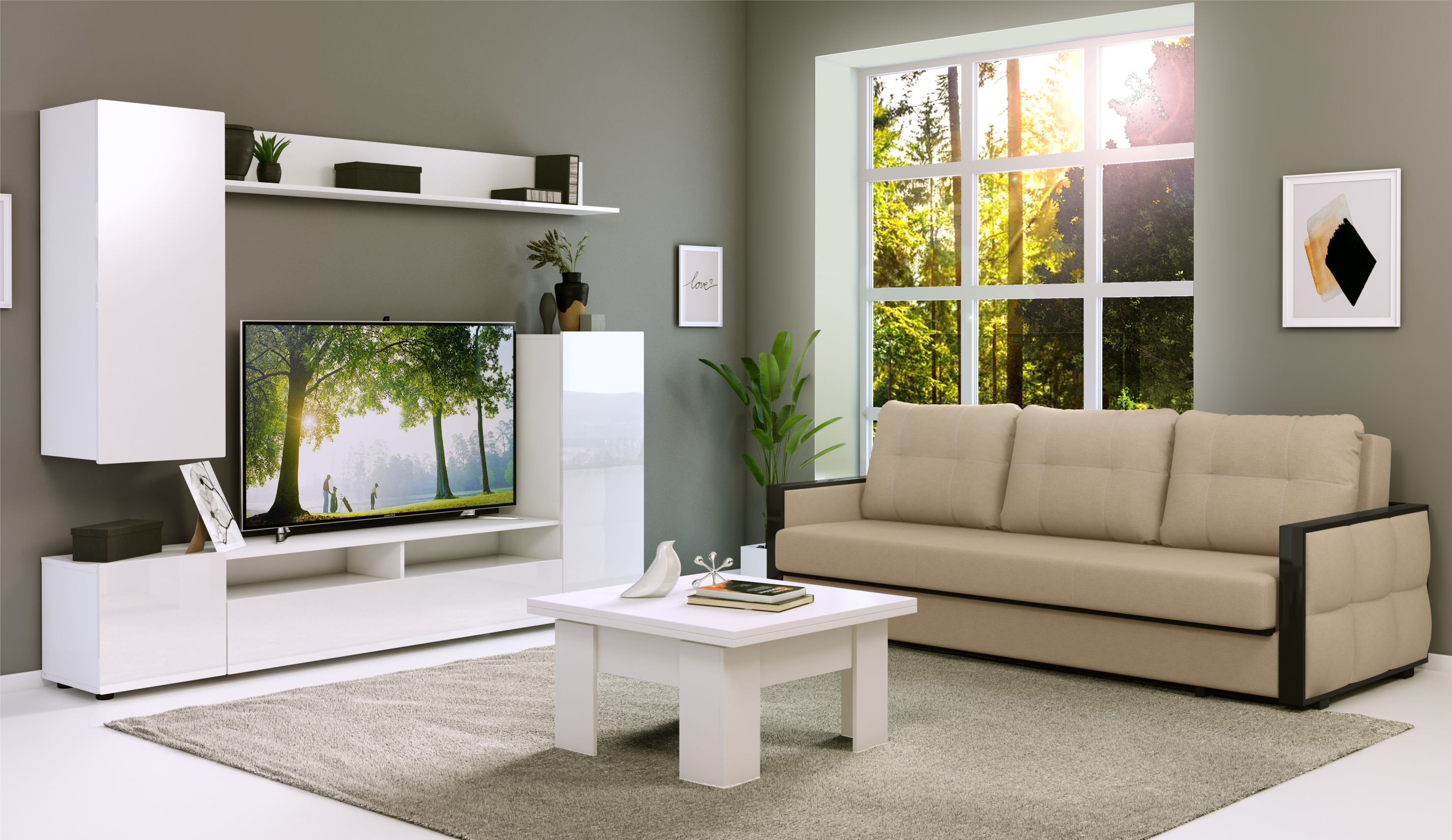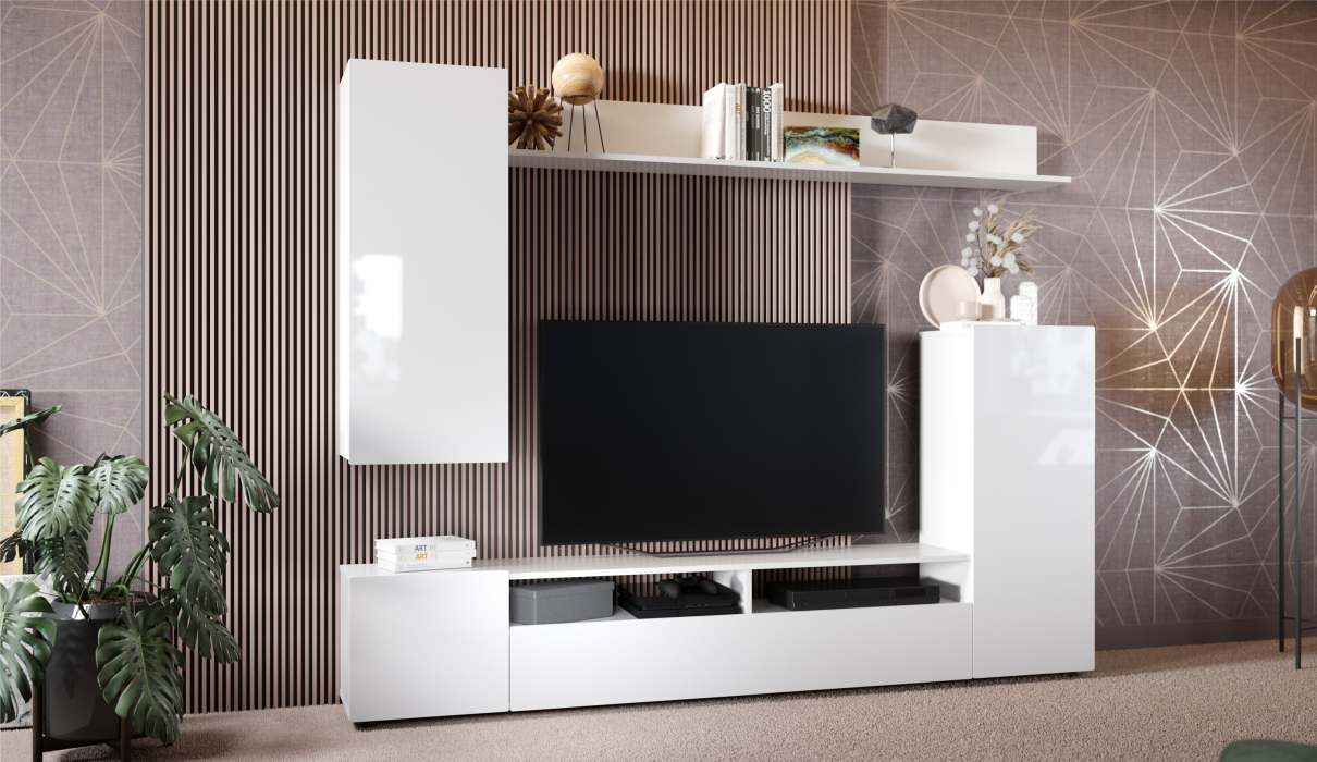 Стенка Лия выполнена в современном европейском стиле. Её дизайн совмещает в себе актуальные тренды: белый глянец, скругленные фасады МДФ, отсутствие лицевой фурнитуры. Белый цвет отлично сочетается со всей цветовой палитрой, что позволяет создавать яркий интерьер и компоновать с другой мебелью. Стенка включает в себя нишу под ТВ с открытыми и закрытыми полками для размещения приставок, медиа устройств, книг и элементов декора.