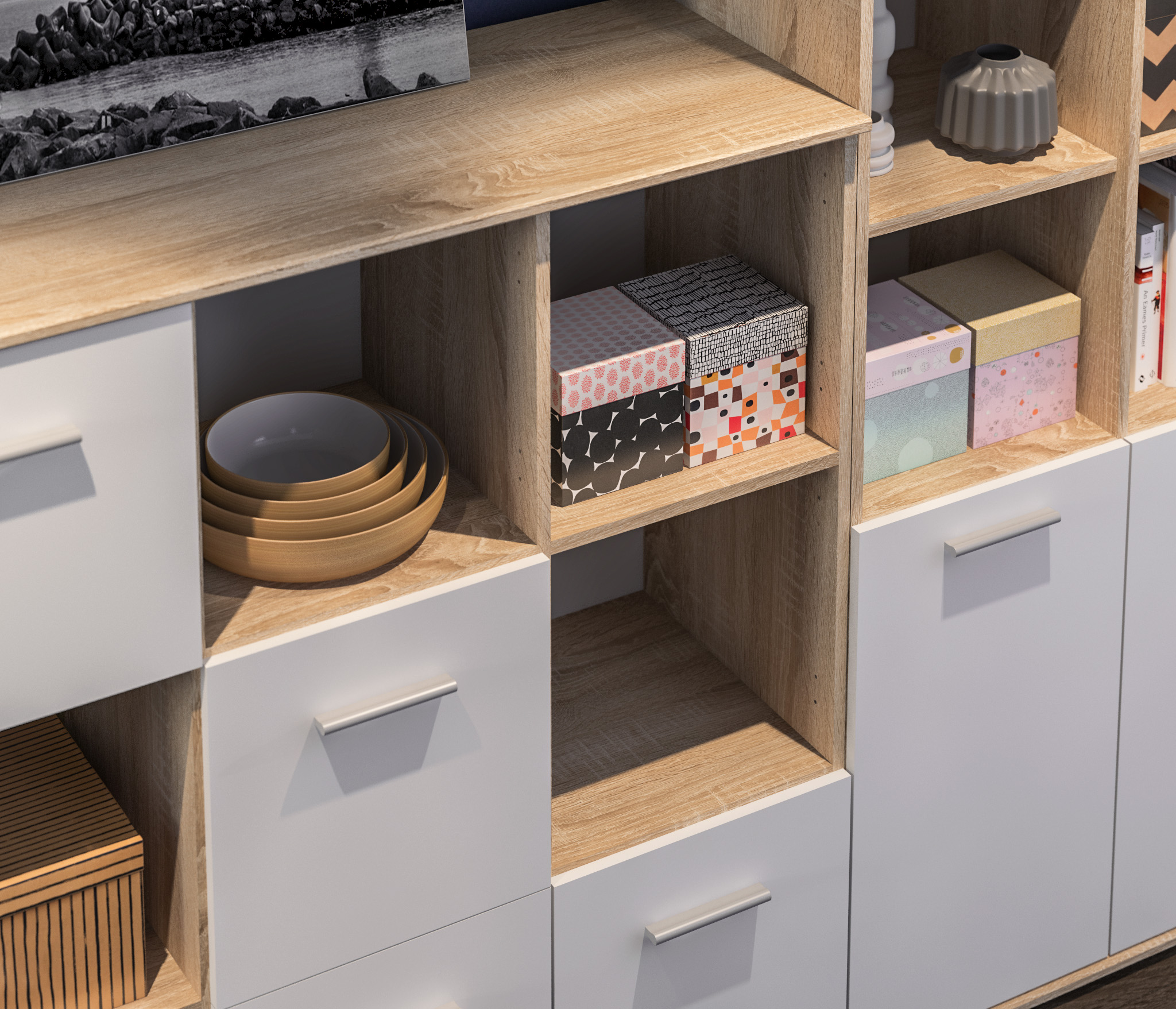 Габаритные размеры – ширина 78 см, высота 176 см и глубина 44 см. Конструктивно стеллаж состоит из нескольких вместительных открытых полок и из отделения с непрозрачными дверцами.Модель производится из современного материала КДСП. Отделка комбинированная – корпус в цвете «Дуб Сонома», фасадные поверхности белые.