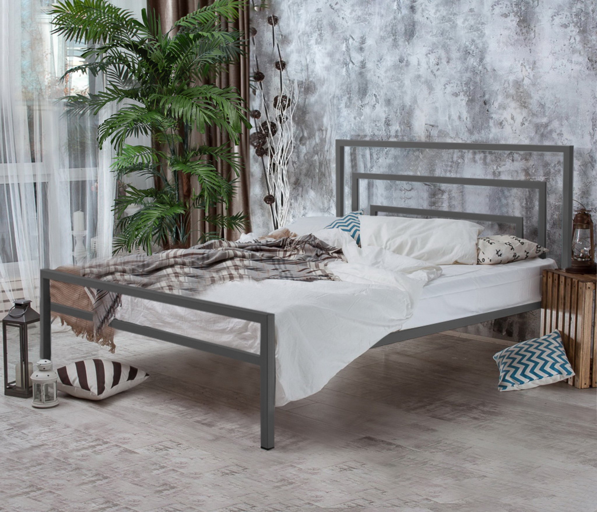 Металлическая кровать Атланта - изысканная, эффектная кровать в стиле лофт ручного исполнения, которая будет уместна как в интерьерах соответствующей стилистики, так и в комнатах, оформленных в любом современном направлении дизайна.