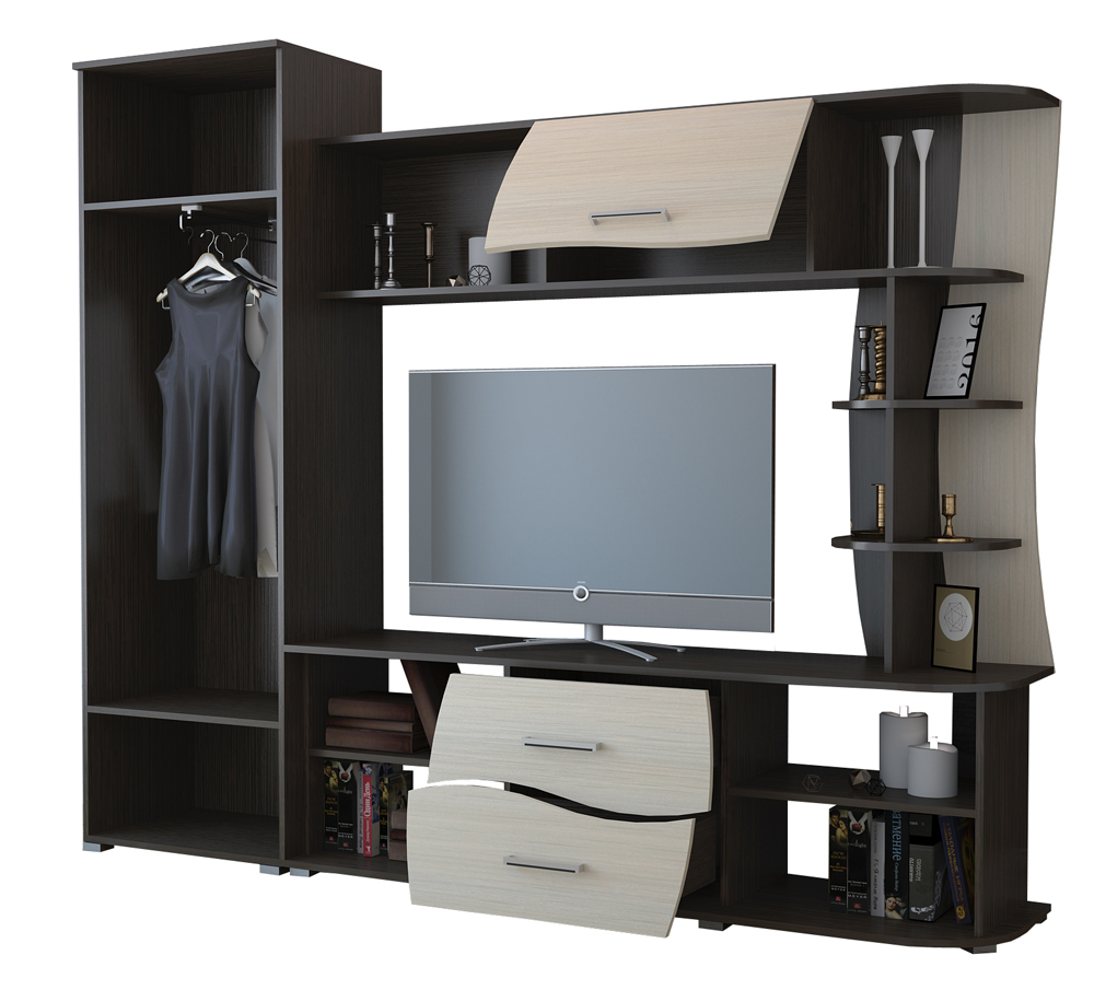 Лучшая цена, плавные линии, комбинирование цвета, открытые полки, шкаф платяной с выдвижной штангой.