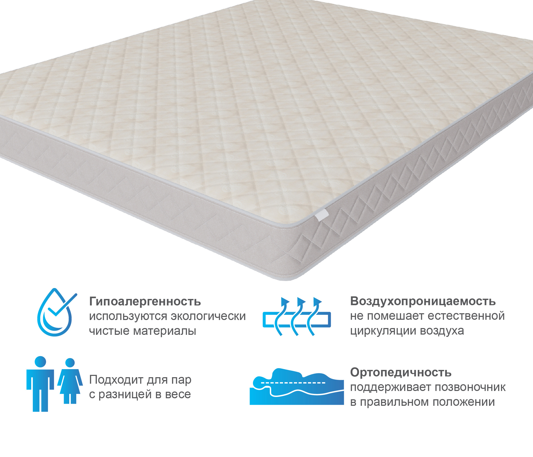 Это классическая конструкция матраса, универсальный блок пружин с точечной поддержкой, термоволокно, которое защитит комфортные слои от соприкосновения с пружинами и соответственно истерания. Слои кокоса добавят необходимой жесткости и прочности.