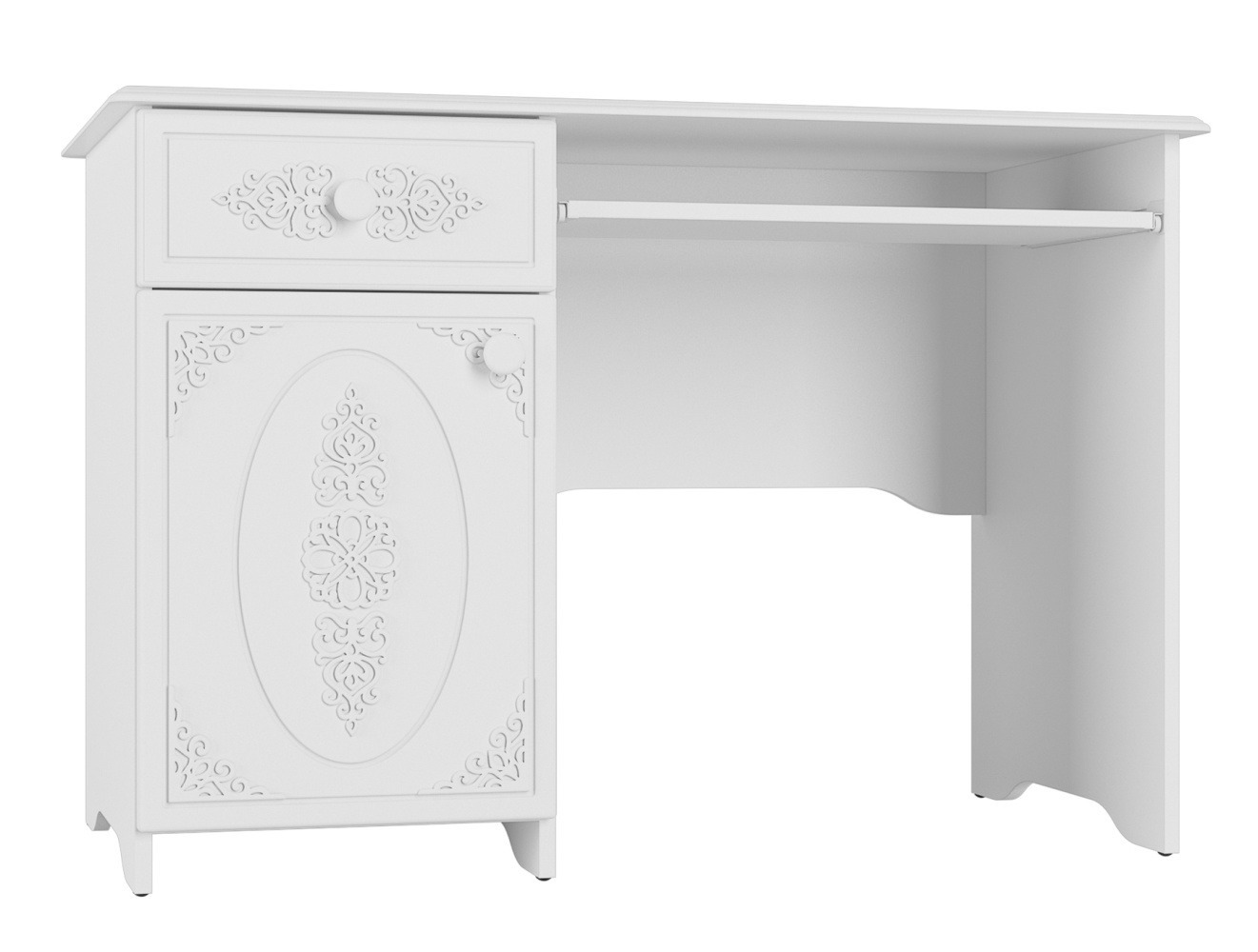 Письменный стол с выдвижным ящиком и тумбой. Размер столешницы 1100 мм * 600 мм. Может использоваться, как стол для компьютера. Снабжен выдвигающейся панелью 300 мм * 600 мм для клавиатуры.