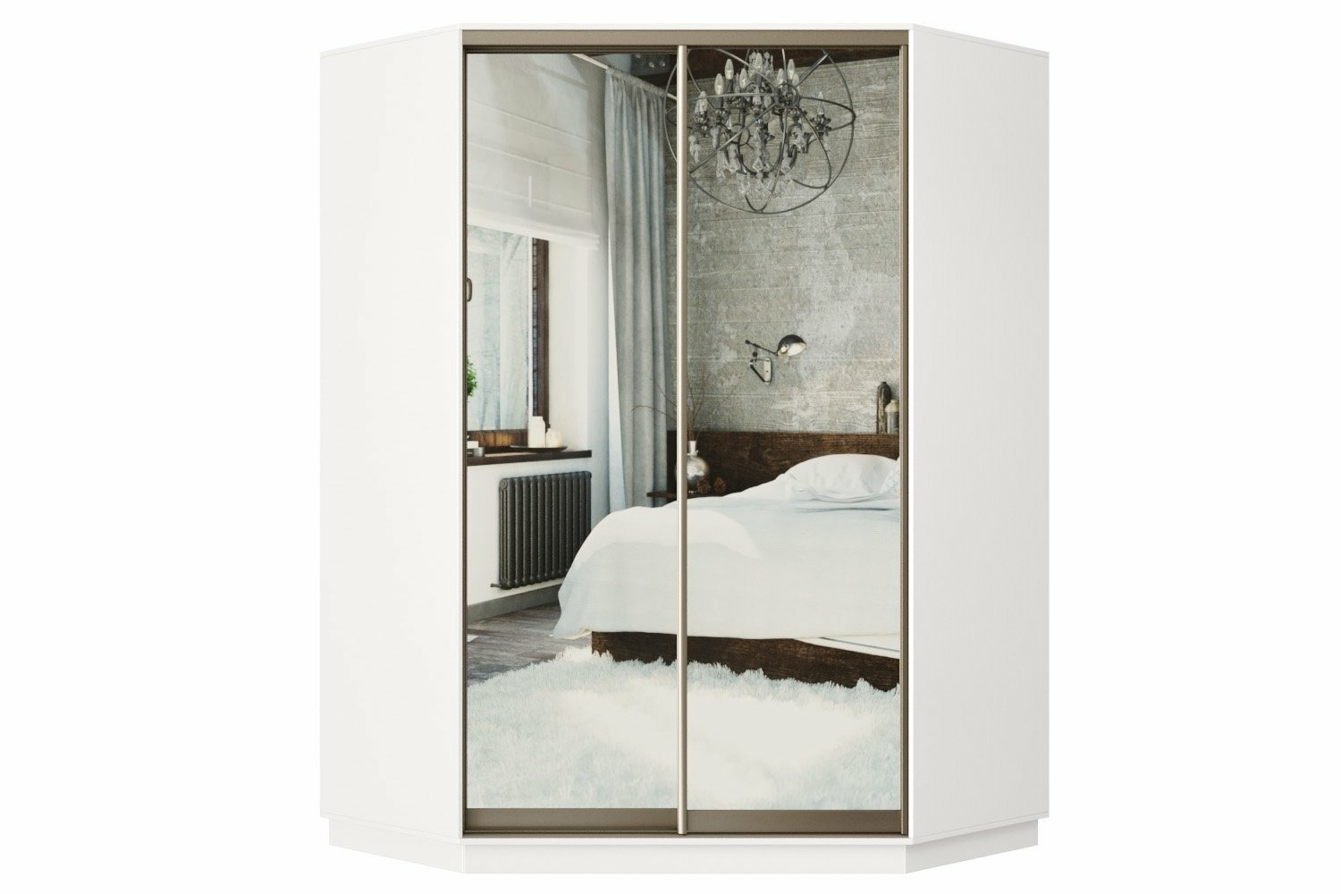 Просторный двухдверный угловой шкаф-купе предназначен для хранения одежды и постельного белья.