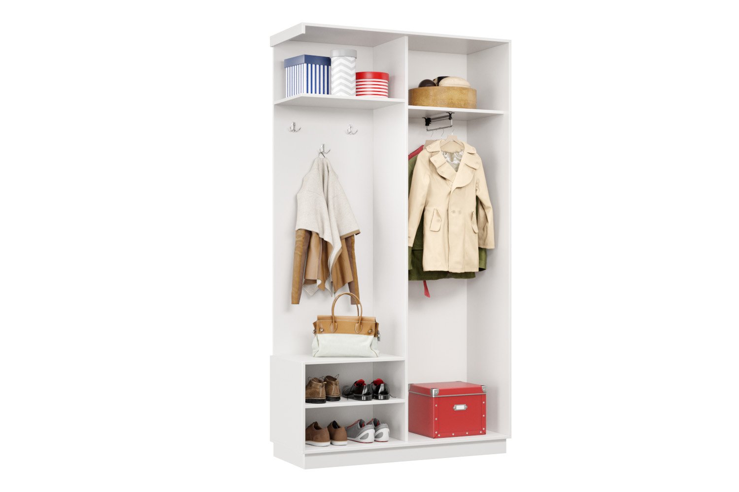Дверь делит шкаф на 2 равные части: отделение для верхней одежды и отделение с полками и крючками.