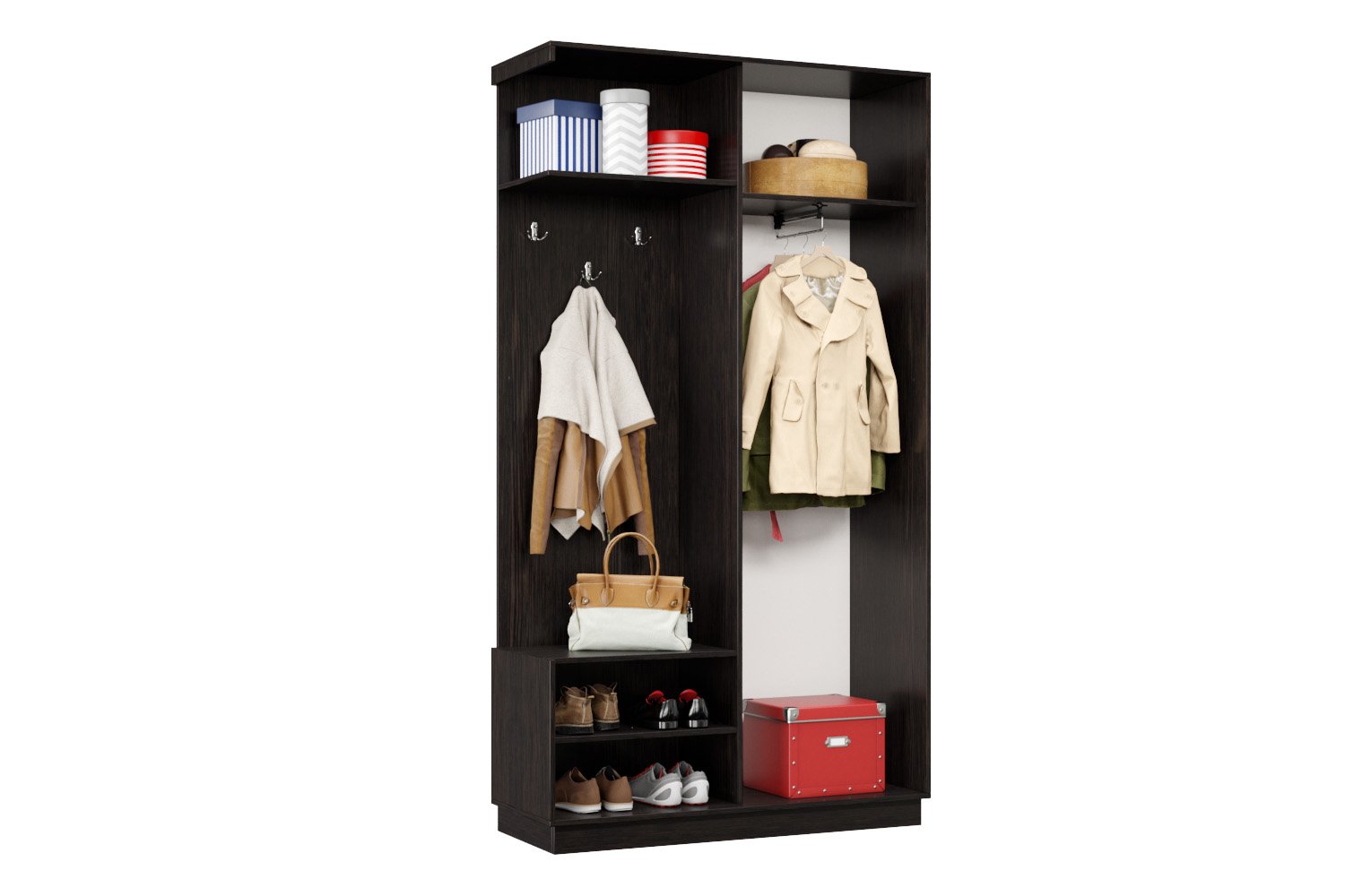 Дверь делит шкаф на 2 равные части: отделение для верхней одежды и отделение с полками и крючками.
