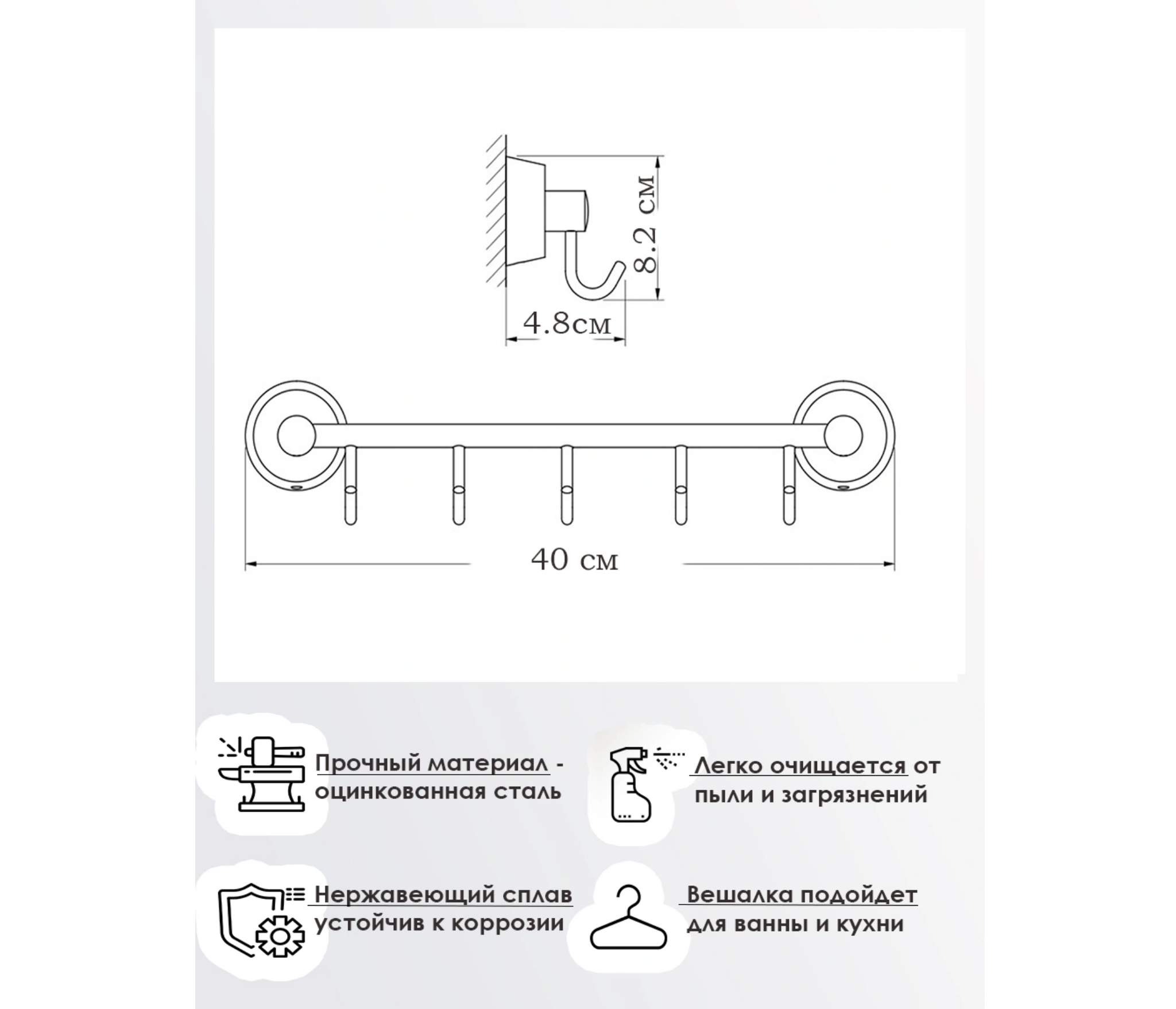 Вешалка изготовлена из материала, устойчивого к постоянному воздействию влаги. Монтаж с помощью сверления надежно зафиксирует аксессуар на любом стенном покрытии. Незаменимый аксессуар для полотенец.