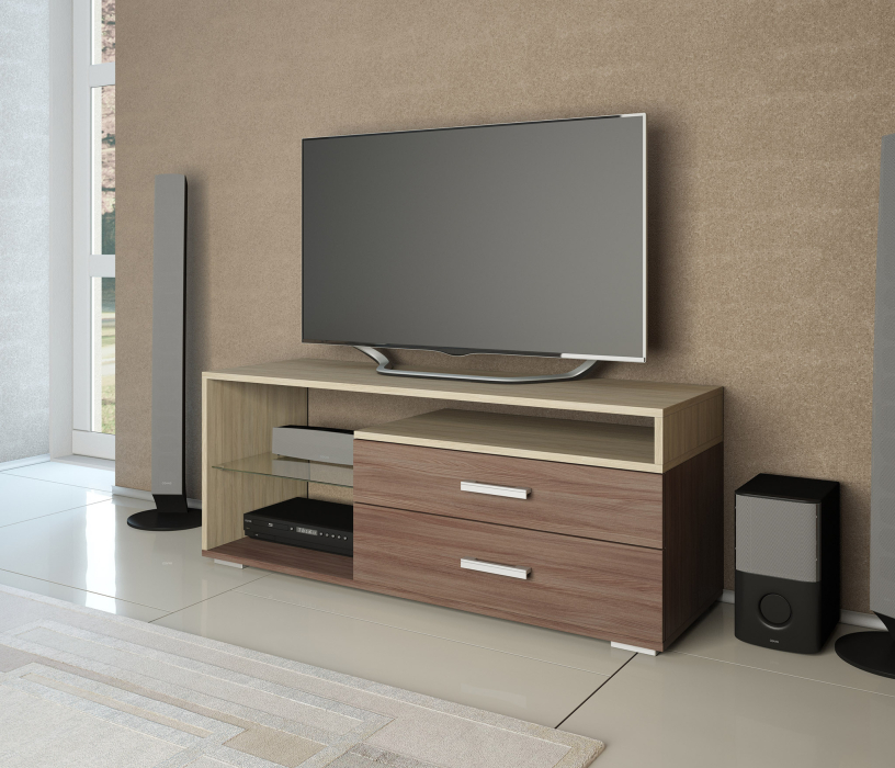 Большая ТВ-тумба имеет широкую столешницу, которая подходит для телевизора практически любой диагонали. Открытые полочки подойдут для игровых приставок или видеоплееров, а два вместительных ящика позволят разместить сопутствующие аксессуары.