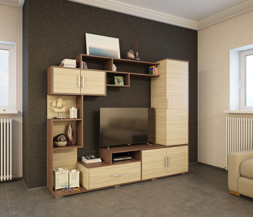 Конструкцией предусмотрен шкаф с полками для хранения одежды, постельного белья и других вещей. В основании располагаются открытые ниши и закрытые отделения. По периметру стенка имеет полки разных размеров для книг, фотографий, предметов интерьера и других мелочей.