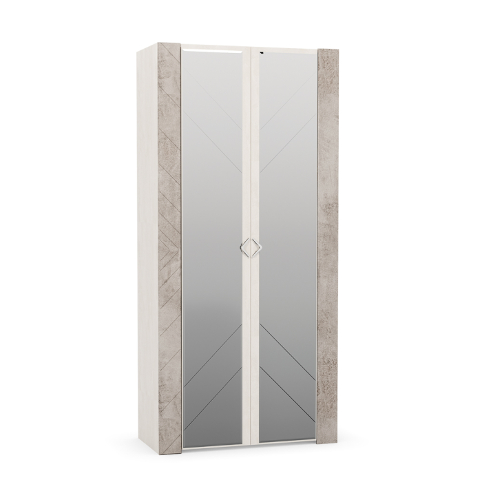 Прямой двухдверный распашной шкаф. Лицевая фурнитура — металл, хром, зеркало. Наполнение: полки и штанга. Максимальная нагрузка на полки — 4 кг.