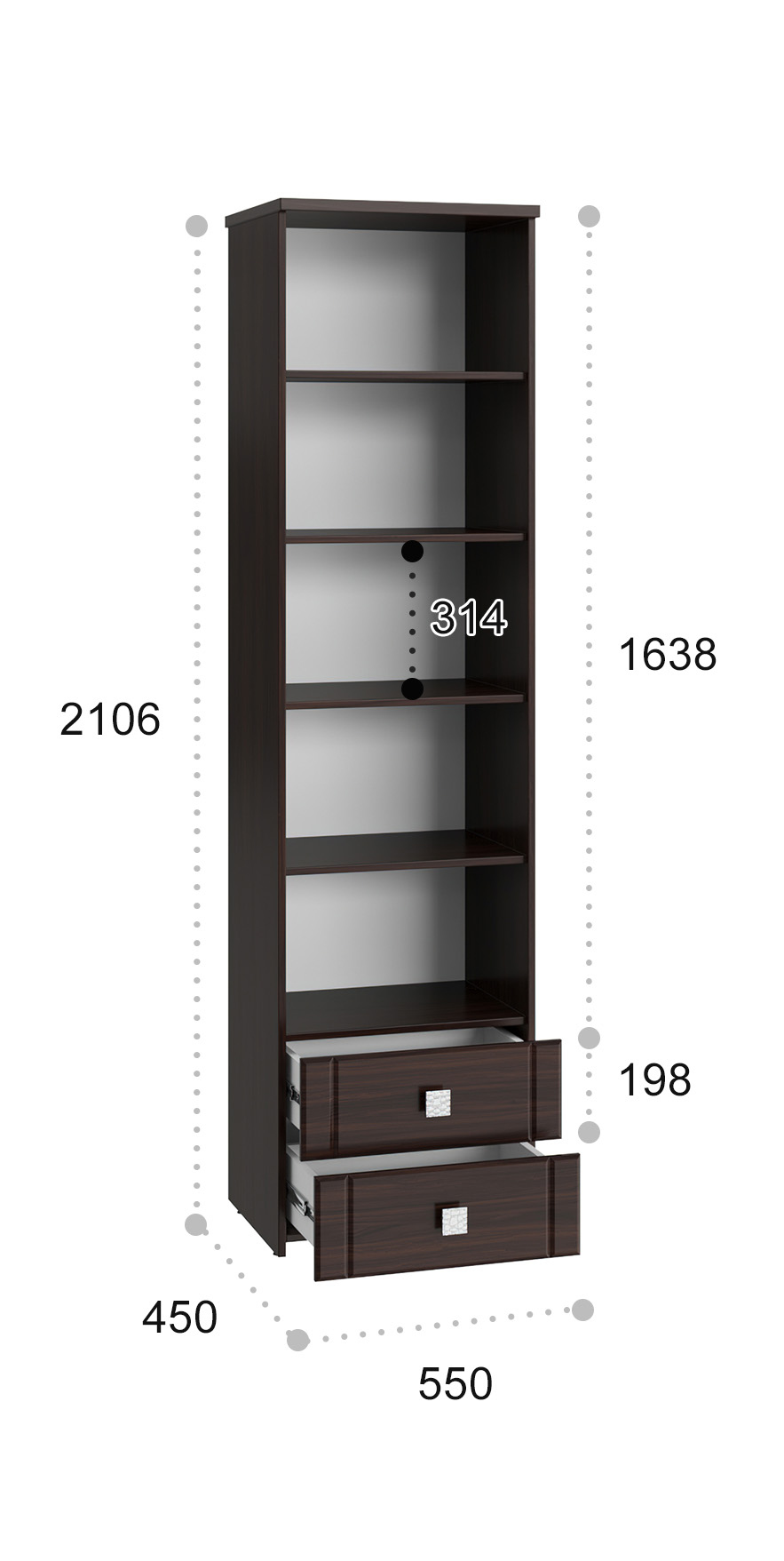 Размеры модуля (ш/в/г) вмм: 550х2106х450. Материал корпуса/фасада: ЛДСП, МДФ.