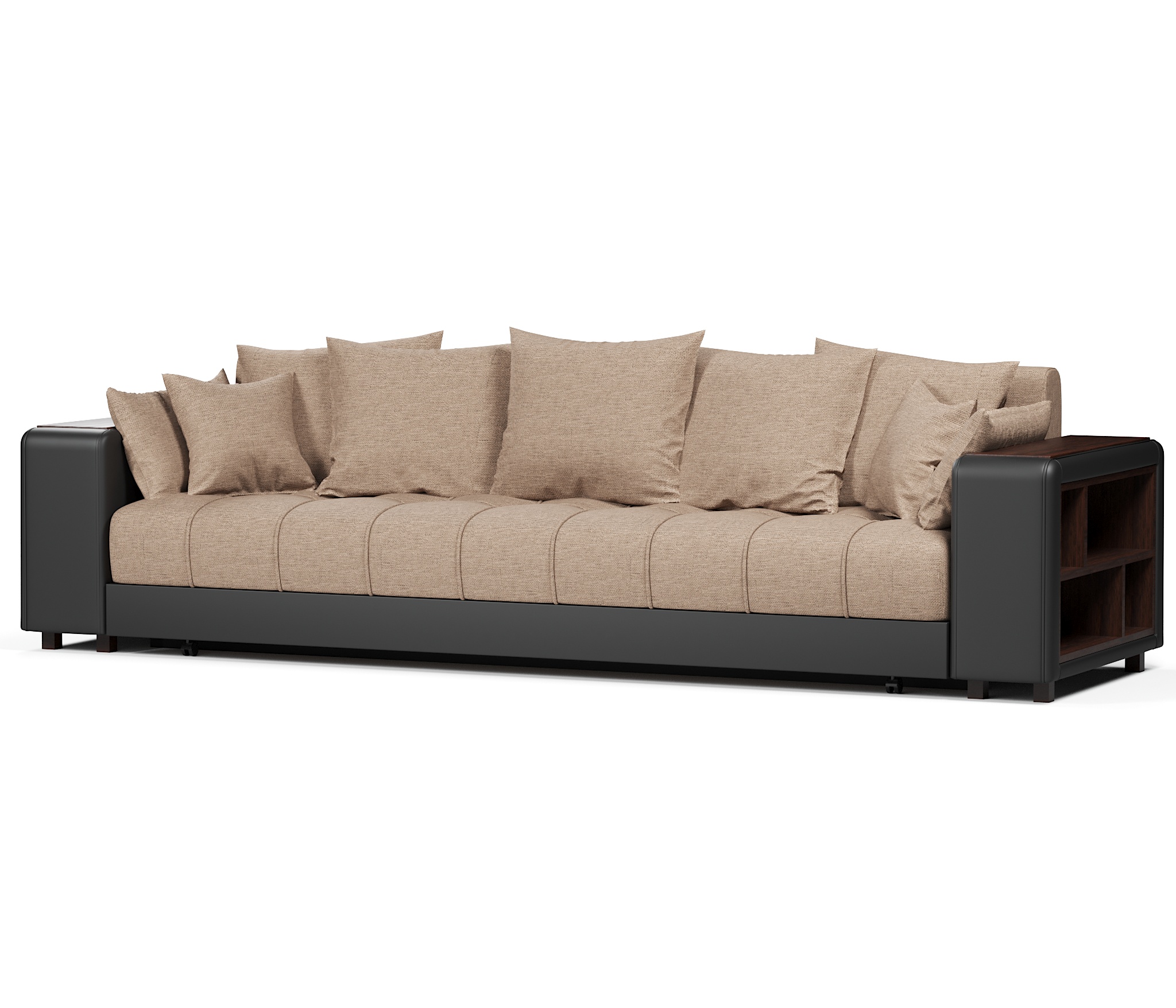 Прямой диван Дубай это отличный выбор для тех, кто планирует создать уют в своей квартире. Модель имеет выдержанный дизайн без элементов, которые перегружают её. С одной стороны в подлокотнике установлены полки, куда вы сможете складывать различные мелочи, пульт итд.