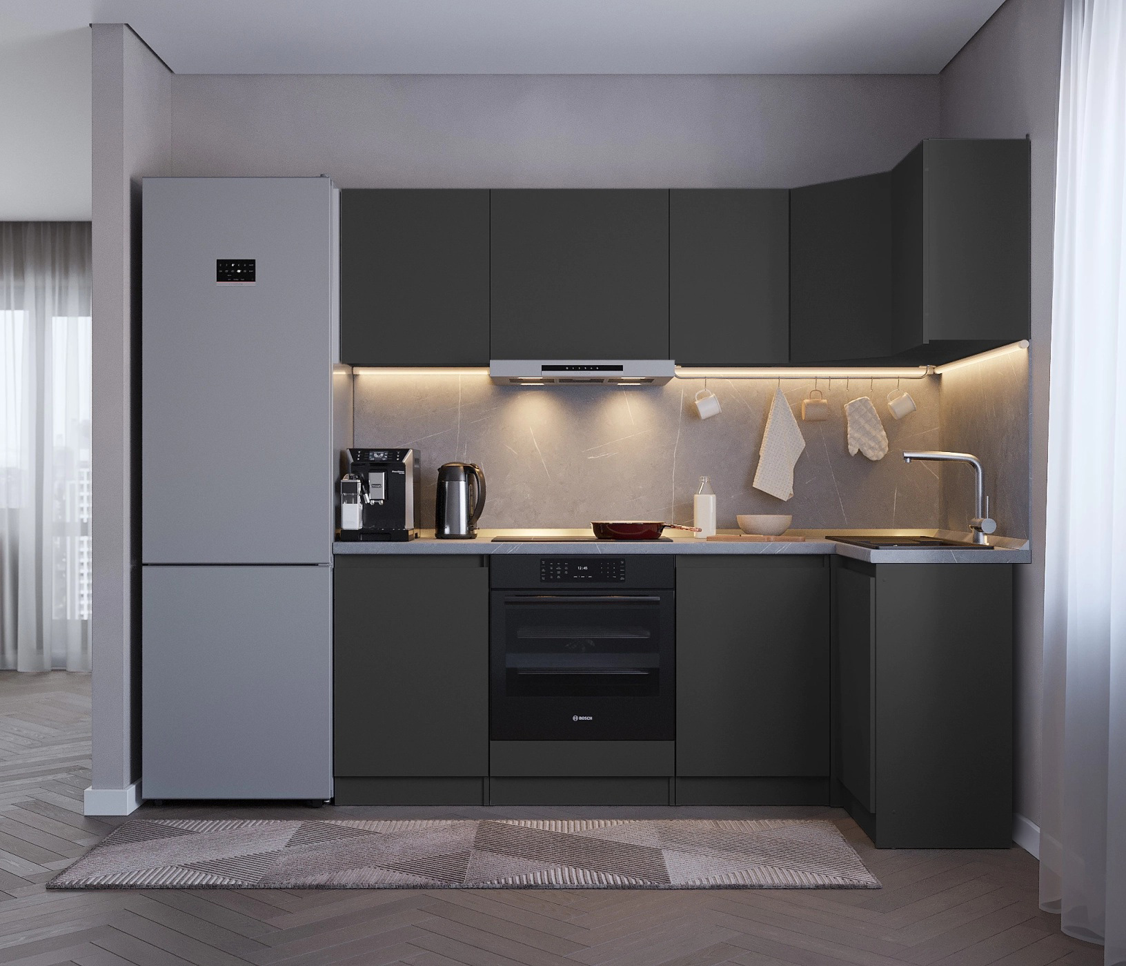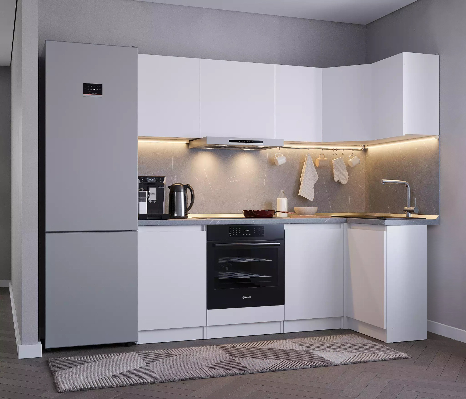 Столешницу, стеновую панель, мойку, сушку, планки, плинтус, бытовую технику.